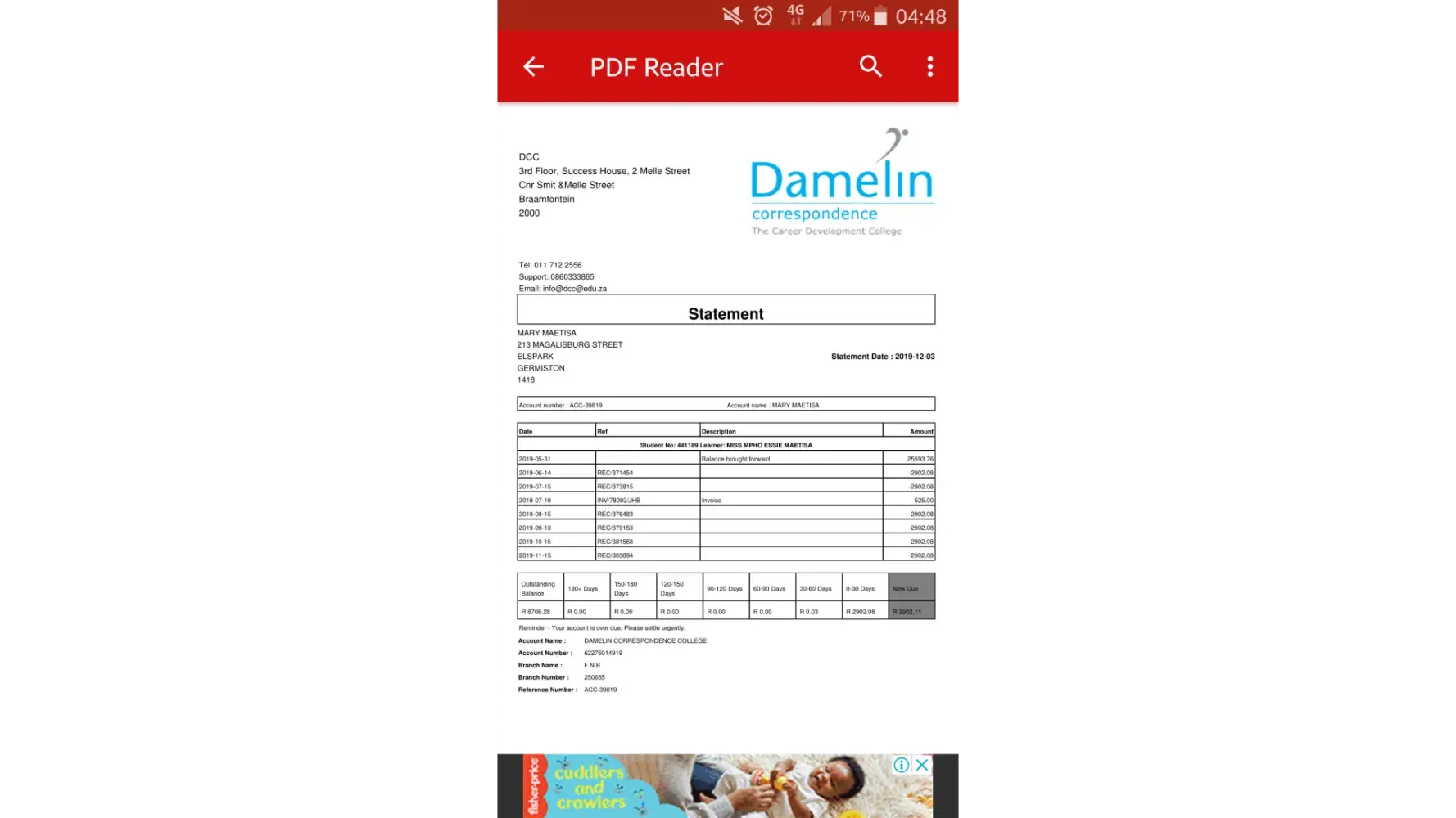 Last week Thursday 1 December my bank account was debited with an amount of R1569.This amount was incorrect. This was not my error but the college. I have called 4 times and everyone sends me in different directions. I am extremely upset that I need to go through a whole process when the system wasn't updated on DCC's end,