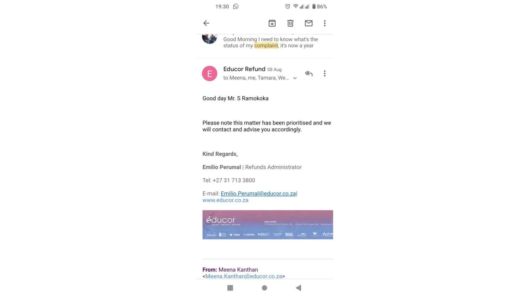 My refund is only R6000-00. I have explained to Cleyvon and Emililo that I am a hand to mouth..the same explanation the account is with finance they will contact me. Till today nothing is been done.