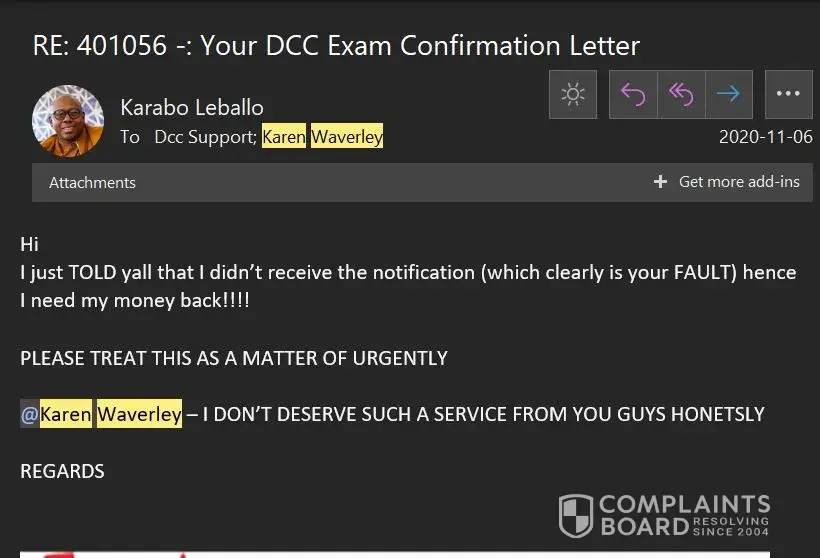 On the 3 march 2022 Hyram send me an email saying once i receive my student number from head office i should log in on the dcc website blah blah blah. I then replied to say i am following up as i still have no student number and i am still not registered.