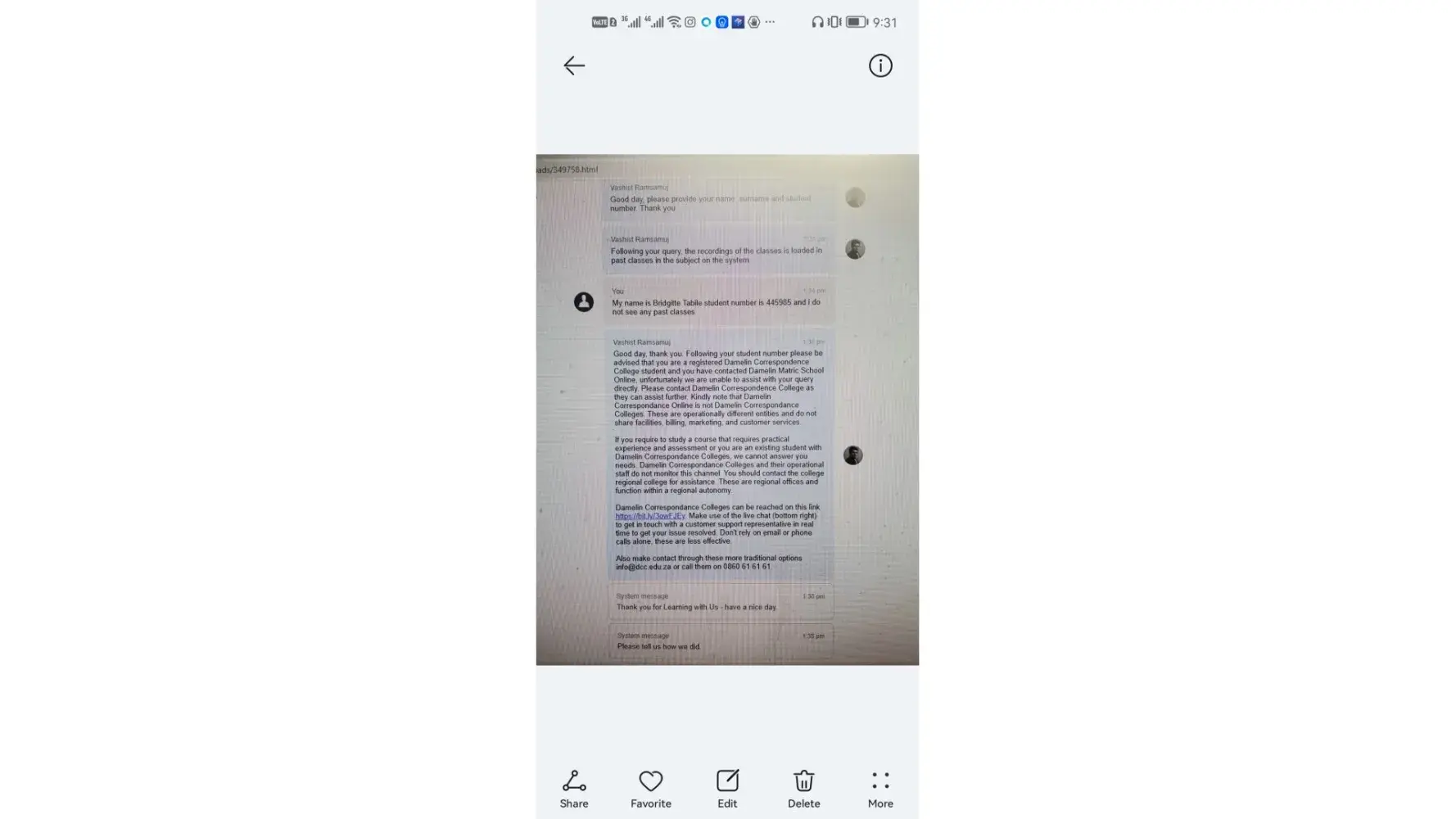 I saw there was a livechat feature and i chatted with someone called Vashist and advised that i cannot access any recordings of the classes and that i am missing out and when i gave him my student number he told me that he cannot assist me because i am not registered for Damelin Matric school and i need to contact whoever and i did exactly what he told me, i never ever received a response from that email address. I also sent an email to Hyram to explain what happed and enqired about it, he told me to send an email to support which i did with no response. After 7 days of sending these emails with no response i decided to visit Hyram in the office on the 31 March. I asked him why am i not granted access to classes yet he told me i will receive classes and that recordings will be available. He told me he also does not understand and that he has inquired this with head office they are refusing to give me access to classes. He also told me that he was under the impression that i will get classes that's why he mentioned it to me. I complained and said i have no support and no one to consult if I'm stuck. Exams were going to be a week alway and i still am clueless.