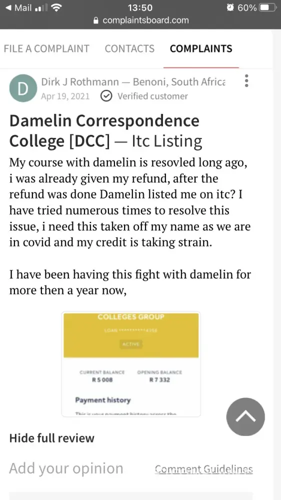 My course with damelin is resovled long ago, i was already given my refund, after the refund was done Damelin listed me on itc? I have tried numerous times to resolve this issue, i need this taken off my name as we are in covid and my credit is taking strain.