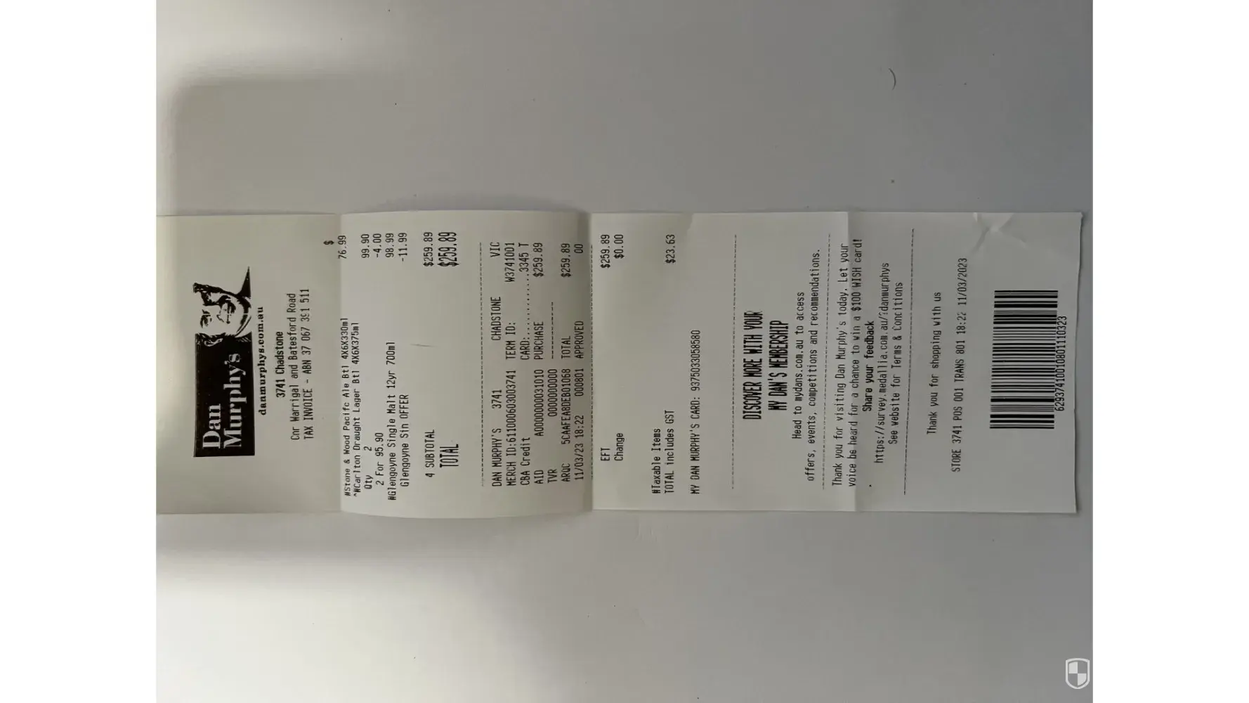 This occurred on the 13th of March 2023, refer to the attached receipty.