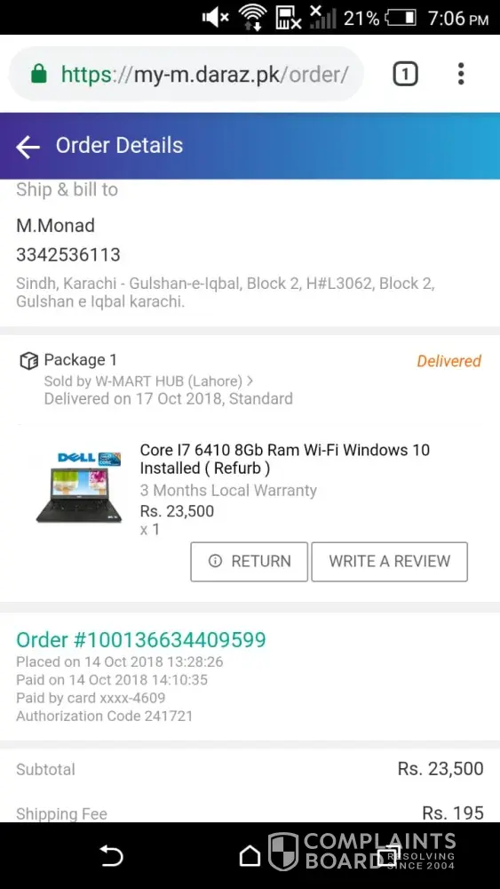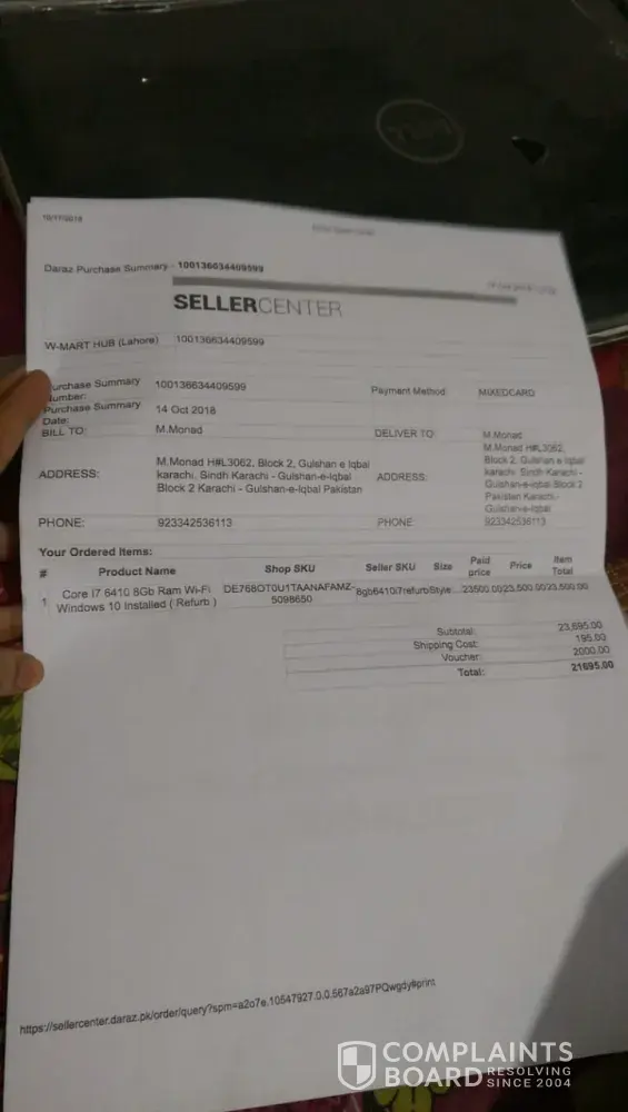 I've ordered a product from Daraz.pk on 5th October 2018, and i have paid through card and the order was processed and confirmed. The timeline was from 6th to 11th October but today is 29 and it's still not received. It's status was changed to Shipped on 13th October and they told me that you will soon received it. But it didn't came. I have complained 6 times but they are not helping me they just said that your complain is updated and we are working on it. Nothing else. The tracking code is still not working on leopard website. I can't cancel it because they told me that you can't because it's already shipped now. So they told me to wait. I am waiting since 11th October. It's been 24 days and they are not helping me out. Please check it out.