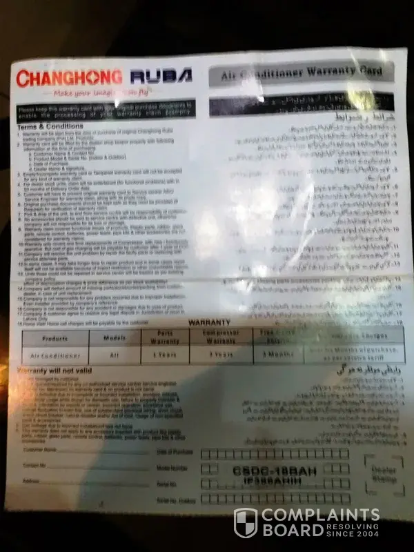 Would like to inform you that I have been purchased Changhong Ruba DC Inverter 1.5 Ton model CSDC-18BAH from Daraz.PK under head of order # [protected] from one of your registered dealer Electronics Cornor (Lahore) some days back i-e is May 10, 2018, however since starting I have been facing the issue with the product, product air flow were fine however its not chill the room, hence not working as per their capacity offering by company. Unfortunately some days back product become totally despondent and based on my complaint company engineer was visited at my home and reviewed the product, it became wondered and shocking for me, when he informed me that Daraz.PK team has sent you a fake product which is not up to the marked as per company standard, hence we/company are unable to provide you warranty claim or repair, where I have valid warranty card which I have been found with product, warranty card attached with other delivery details.