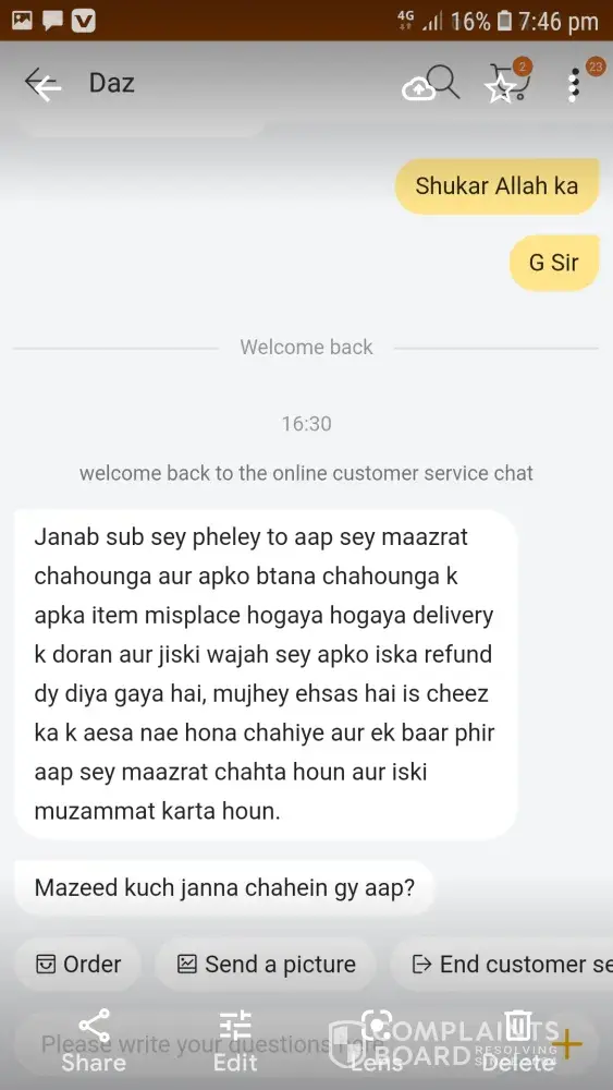 Order k barai main pouch Shoaib Hussain s help centre k liv chat ROM main apnai apsai order department said khai k mera cancel krva dya or sorry khati raga mera order satuts lost hogya sth main return nhi kr rahai