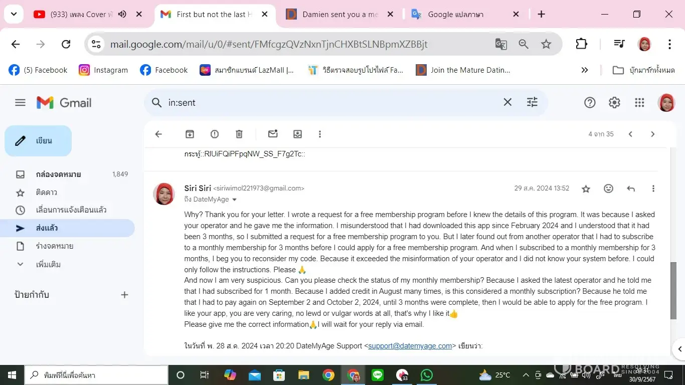 My id is [protected]. I sent you an email on 29/8/2024 at 13:52. Thailand time. I have hesitation and doubt and dare not pay credit in october 2024. I ask you to read the email on the date and time that I sent. And please reply to me. I thank you very much. (I have sent you a screenshot for easy verification.)