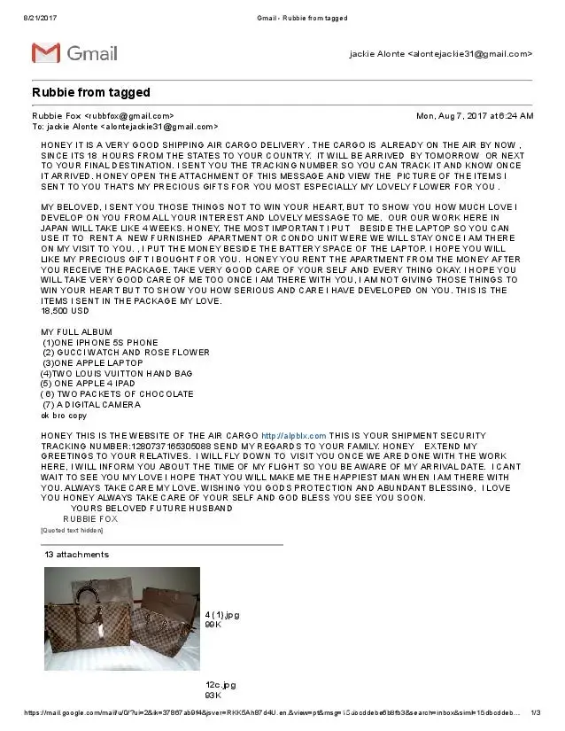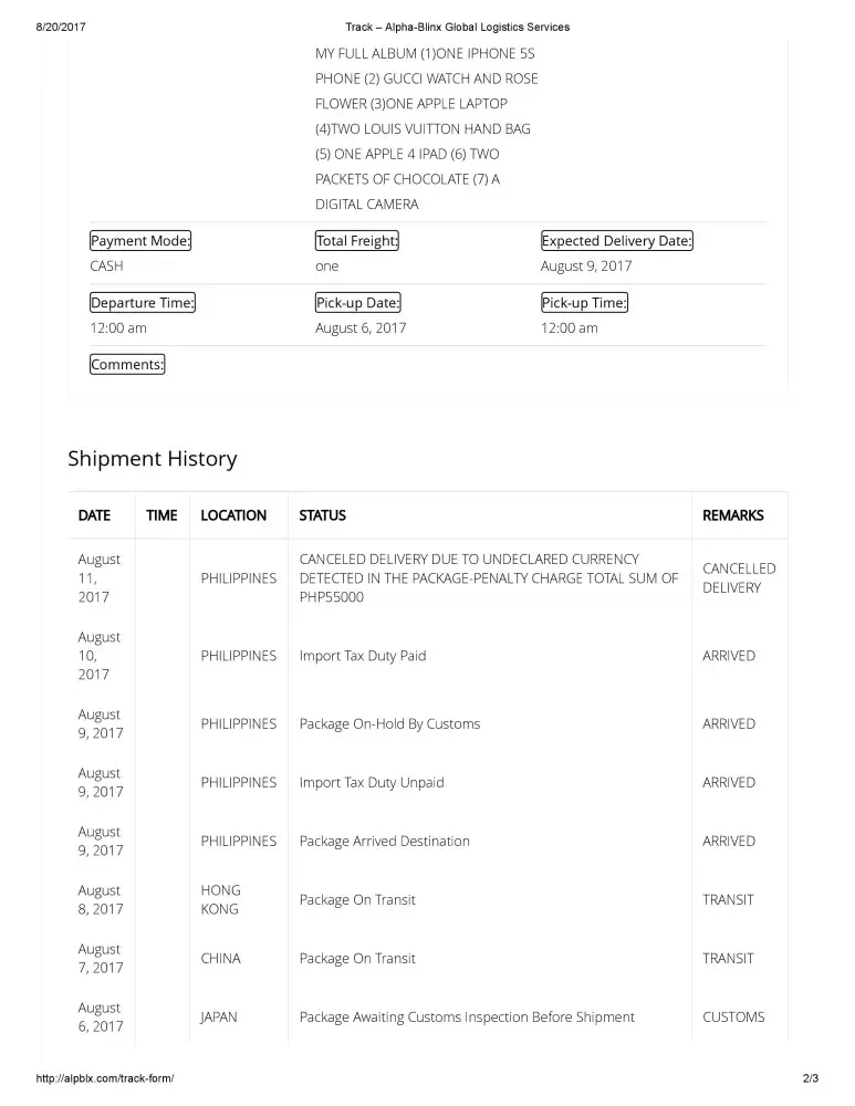 i got box from rubbie fox and ship to cargo name state above but they scan the box and they said that they scan money more than 11K dollars so they ask me about to pay due taxes cost its 18k php then after they scan they found out a money more than 11k dollar s in the box so they ask me to pay 35k php again for releasing my box for delivery then i payed...