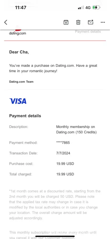 Thank you for sharing your comments. I am sorry if it took this much time to get back to you on this. I'm afraid you have mentioned a platform that does not have any affiliation with dating.com. I would best recommend that you contact their support directly to get the necessary resolution to your billing concern.