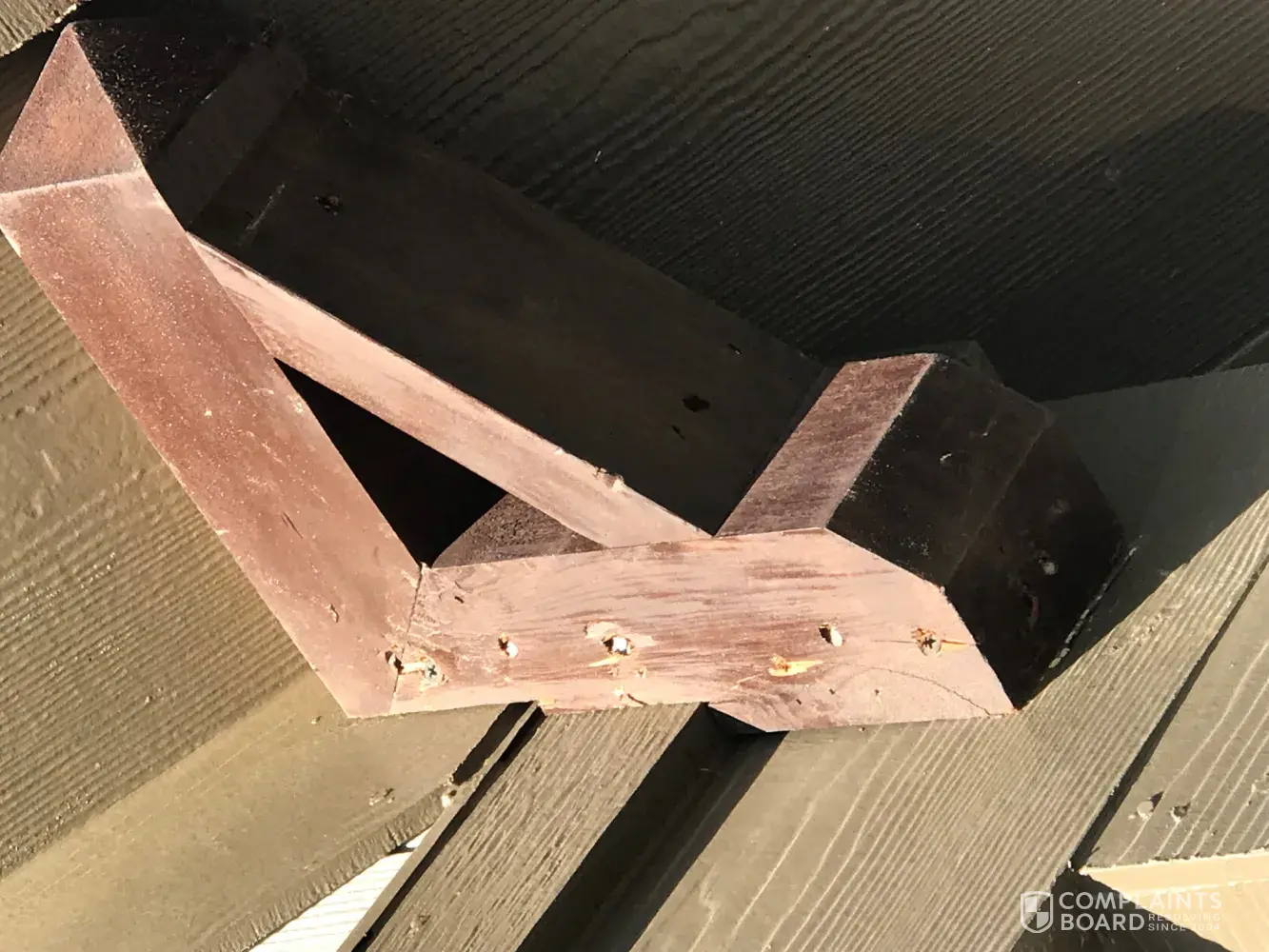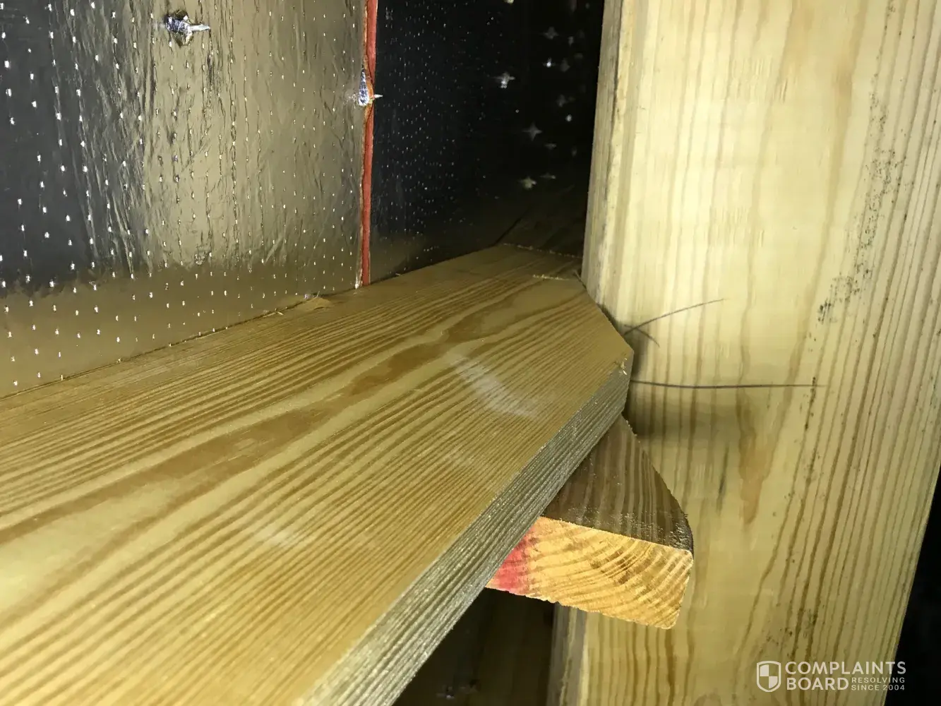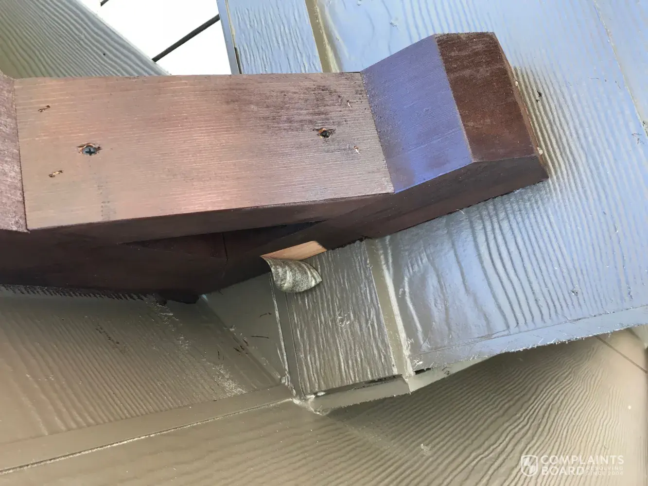 2. Improper gutter installation on dormer roof with water pouring onto shingles leading to deck damage. In 2019, I paid $1000 to change the gutter, repair the roof and water damage inside.