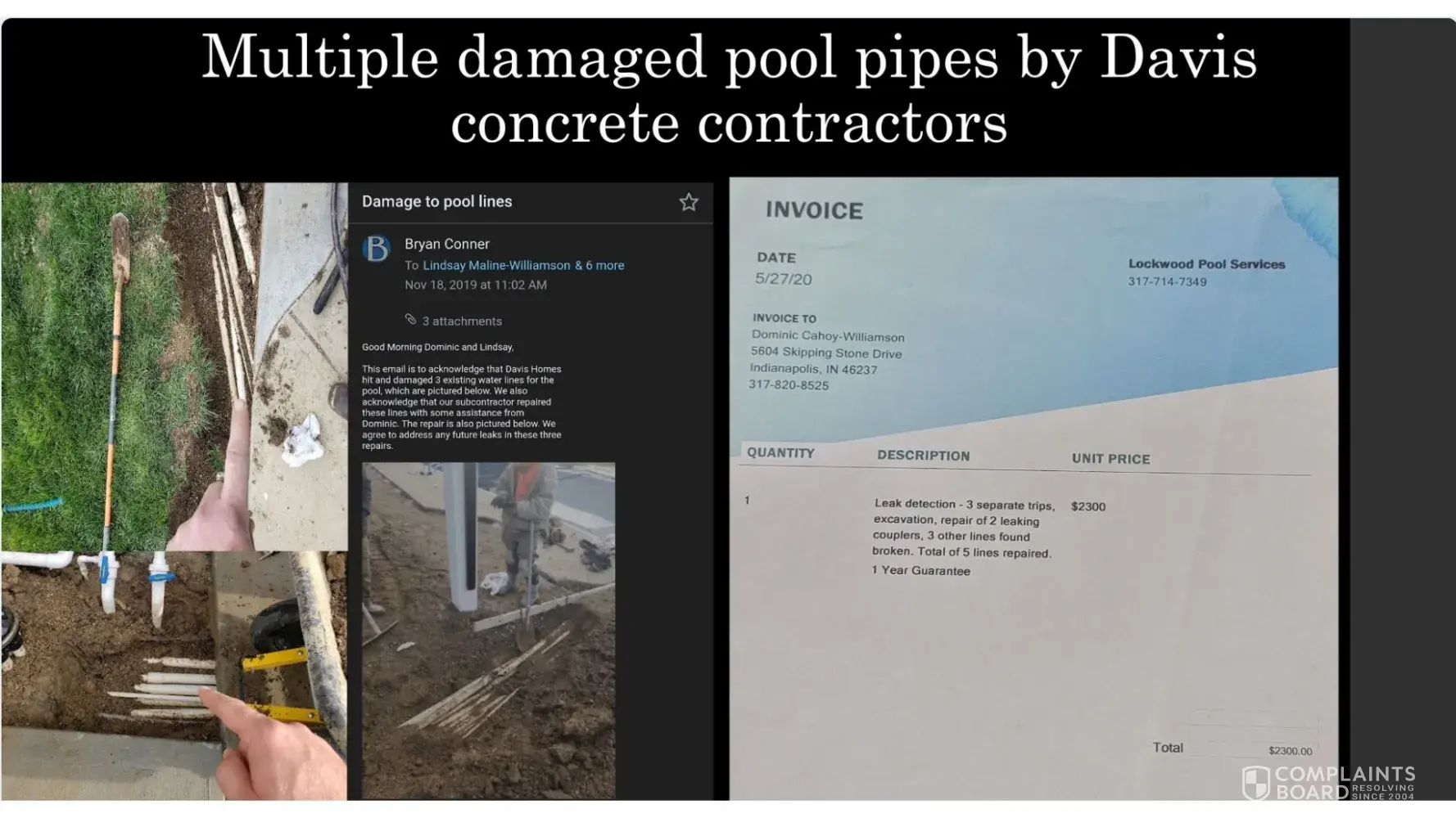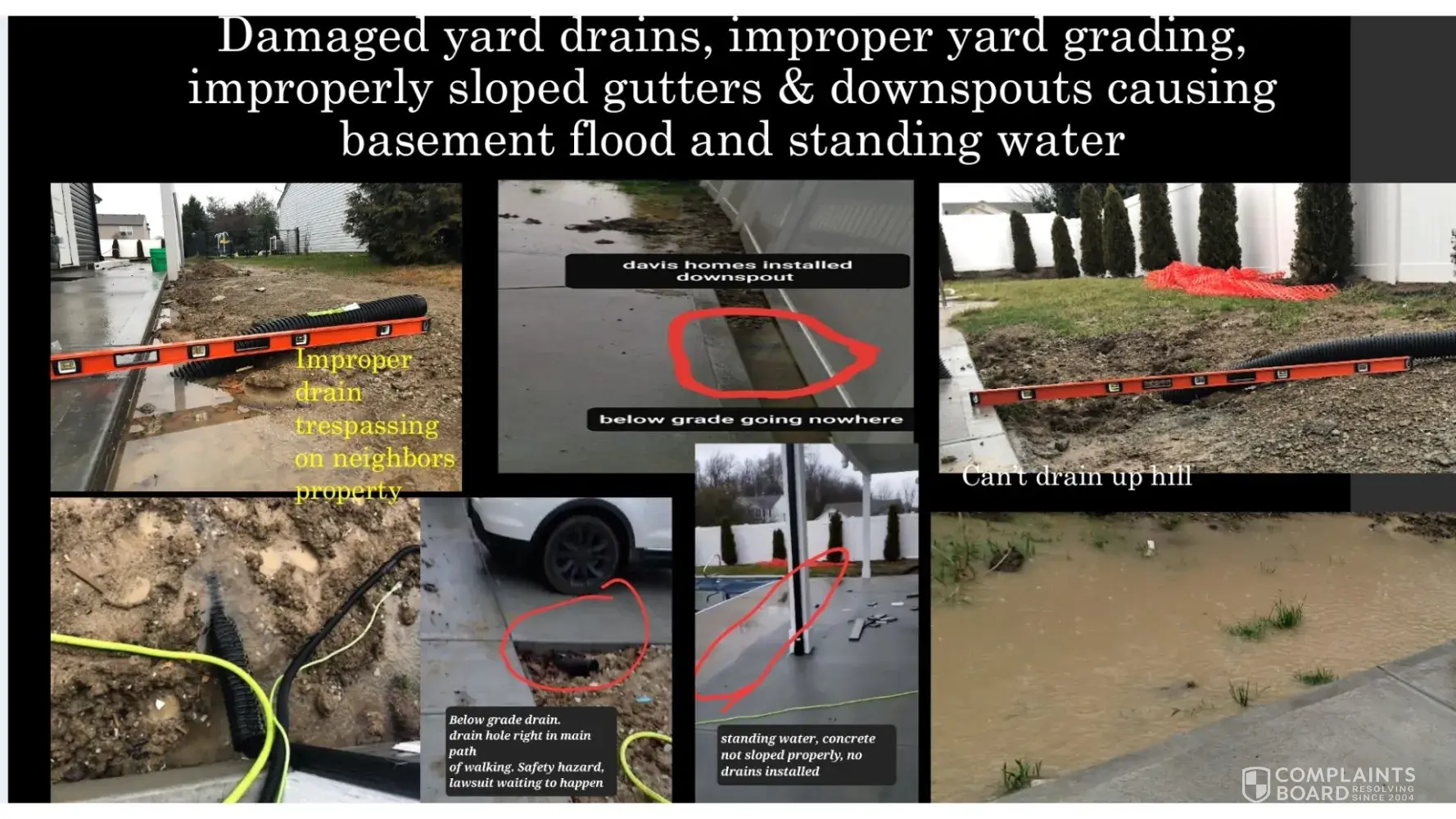 It's been over 3 years of fighting. From our basement flooding after they graded our yard, damaging our concrete by driving a tracked bobcat on it while it was less than a week old, to siding not installed properly for expansion now siding is off all over, damaged roof, drywaller caught urinating all over our garage not noticing he was on camera, to gutters that don't drain, drain pipe running up hill, ripping out our french drains and not replacing, pool lines hit and not fixed, the list is never ending.