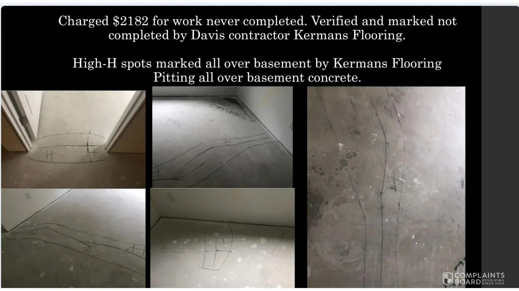 We hired Davis Homes to build our house on our own land. We closed on the house in March . On June 15, we discovered that a 6' diameter area of our basement floor was concave and 1" lower than the rest of the floor. This happened because they put the sewage ejector pit in the wrong place, so they had to break the concrete to move it. The repair for the original pit location was either not finished or not done right. On June 15, I reached out to our construction supervisor to ask if he could fix the floor, since we had other issues he was already working on, or if we needed to use the warranty. He said he would figure out how to fix it. On June 19, the supervisor told me that the concrete contractor could level the area. On July 28, I asked the supervisor if he had any updates from the concrete contractor about fixing the low spot. On July 29, I messaged the supervisor to check if he got my message from the previous day. He replied that he did and was working on getting in touch with the concrete guys. On August 18, I messaged the supervisor again to ask when the basement concrete would be leveled. On August 28, the supervisor messaged me back saying that someone else would handle the concrete floor preparation. On October 5, the concrete contractor called and scheduled the repair for October 7. However, the contractor never showed up. On October 15, I contacted the supervisor to let him know that the concrete contractor didn't show up. The supervisor said he would call the contractor. On November 10, I contacted the supervisor again to inform him that we still hadn't heard from the concrete contractor. The supervisor said he would call me immediately, but I never received a call. On November 11, I contacted the supervisor once more to let him know that I still hadn't received a call. On the same day, I finally received a call from the concrete contractor, who scheduled the repair for November 13. However, on November 13, the contractor called and said he had been in contact with someone who might have Covid19, so we had to reschedule. On December 14, I messaged the concrete contractor, supervisor, and sales agent to ask when we could reschedule, but no one responded. On January 5, I contacted the warranty department about the problem and the lack of resolution. They said that since the other contractor wasn't responsive, their flooring company could level the concrete. Since then, I haven't had any further communication.