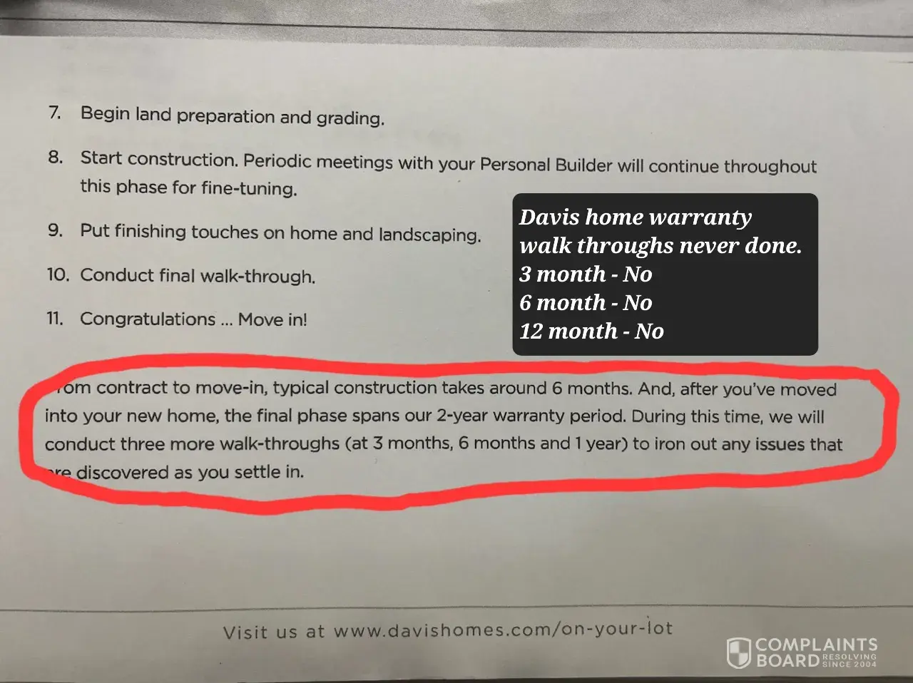 Our families home burned down in 2018. We started in March of 2019 with Davis homes, it is now November 2023. We have never had a 3 month, 6 month or 12 month warranty walk through. To this day any issue that we've had had been declined without even having a rep out.