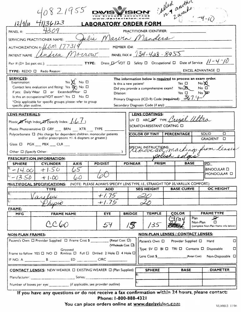 On Nov. 4, I visited my optometrist, Dr. Julie Marvin-Manders at Manchester Eye Care. I have been seeing her for at least eight years, including all of the time that I have had Davis Vision coverage. I primarily wear contact lenses, but had decided this year to get a pair of glasses made; since I rarely wear my glasses and my prescription doesn't change much, I only do this every few years. I am severely nearsighted, so I opted for a high-index lens so that my glasses would not be too thick. The staff at Manchester Eye Care called Davis Vision while I was there to see what the highest index lens they could make was, and what guidelines they might have for me in selecting frames. They determined that the Davis lab could do a certain level of high-index lens, which would actually give me thinner glasses than I currently had, if I selected a frame that was not too big. I selected the frame and placed my order. I had to pay $165 out of pocket at that time, because the high-index lens is not covered, plus I opted for an anti-glare coating and progressive bifocals. I was told that the glasses would take 7-10 days, since the high-index lenses were more time consuming. (Typically, my kids and husband get their glasses - made by Davis - within a week.)