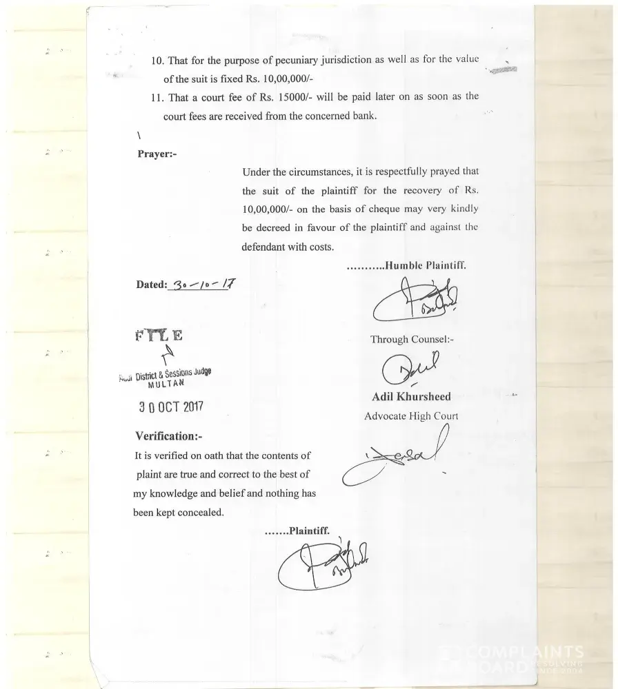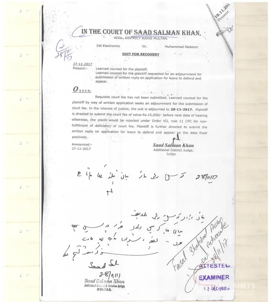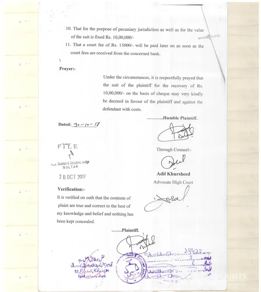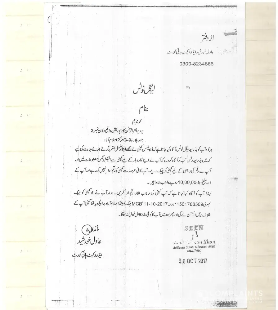Due to negative behavior of Mr. Zaheer, Zonal Sales Manager, a civil suit titled RENDITION OF ACCOUNTS, CANCELLATION OF CHEUQES AND PERMANENT INJUNTION before the honorable court of Mr. Muhammad Shoaib Akhter Civil Judge 1st Class (West) Islamabad.