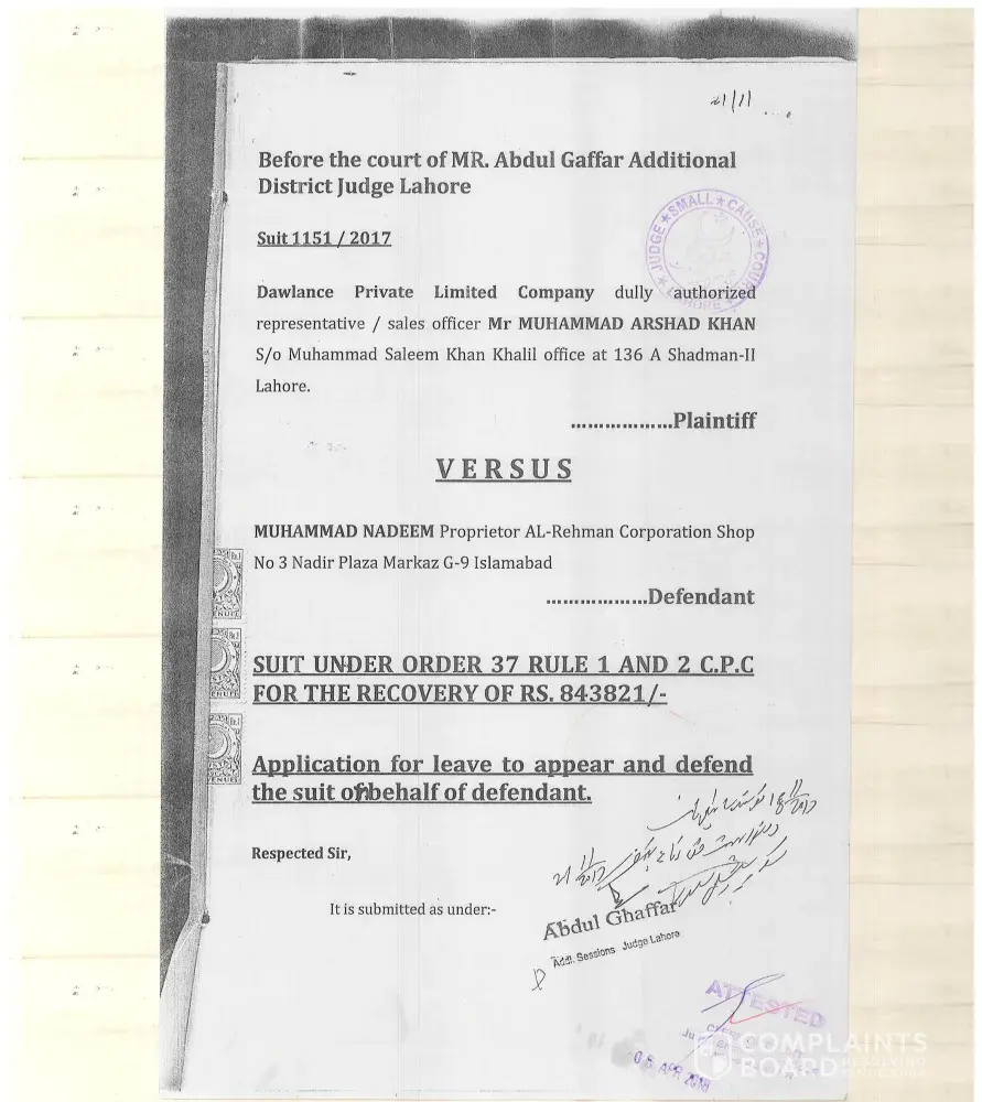 I am continuously asking either in discussions and also in writing to settle my issues with Dawlance but they never pay heed to them and are erecting walls against me by mal-practicing and wrong doings. A very interesting part of this whole episode is this, that Mr. Zaheer, Zonal Sales Manager, Rawalpindi, handing over my post dated cheques to Mr Arshad khan at Lahore Brach and Mr Sajid Baloch at Multan branche with mala-fide intention/ulterior motives without delivery of any goods, just to torcher me and my family and registrated a fake order 37 Suit in Lahare and Multan and then also registered a fake FIR at Lahore by Mr Arshad Khan and Multan by Mr Sajid Baloch, whereas I never been involved in business deals with Multan and Lahore branches of Dawlance. It is also very pertinent to mentioned here that goods of 800, 000/- from Lahore and 1000, 000/- from Multan was also included in my account, whereas I never dealt with the Lahore or Multan branch ever since, I started the business with Dawlance. That it pertinent to mention here that I has no direct relationship with the Dawlance Sales office Lahore / Multan, due to stoppage of invoicing / purchase of product two months ago, I stopped the payment of cheques in the favour of M/s Dawlance Rawalpindi despite the fact that the I contacted numerous authorities of M/s Dawlance Pvt Ltd including Mr. Salih Arsaln Tass C.E.O, Hassan jamil Country Sales Manger Pakistan, Mr. Talal Country Sales Head Karachi, Mr.Rouf Finance Head Head office Karachi, Mr. Asif Mushtaq Butt Regional Sales Manager, Major Ajmad Karachi.