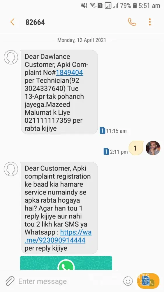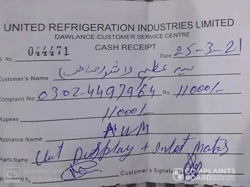 I have deposited 11000 rupees for repair of washing machine at 25-03-21 (at dawalance customer care center Gujrat Pakistan)but still no responses is given yet in this regard.kindly solve this issue .Recipients of payment is attached.