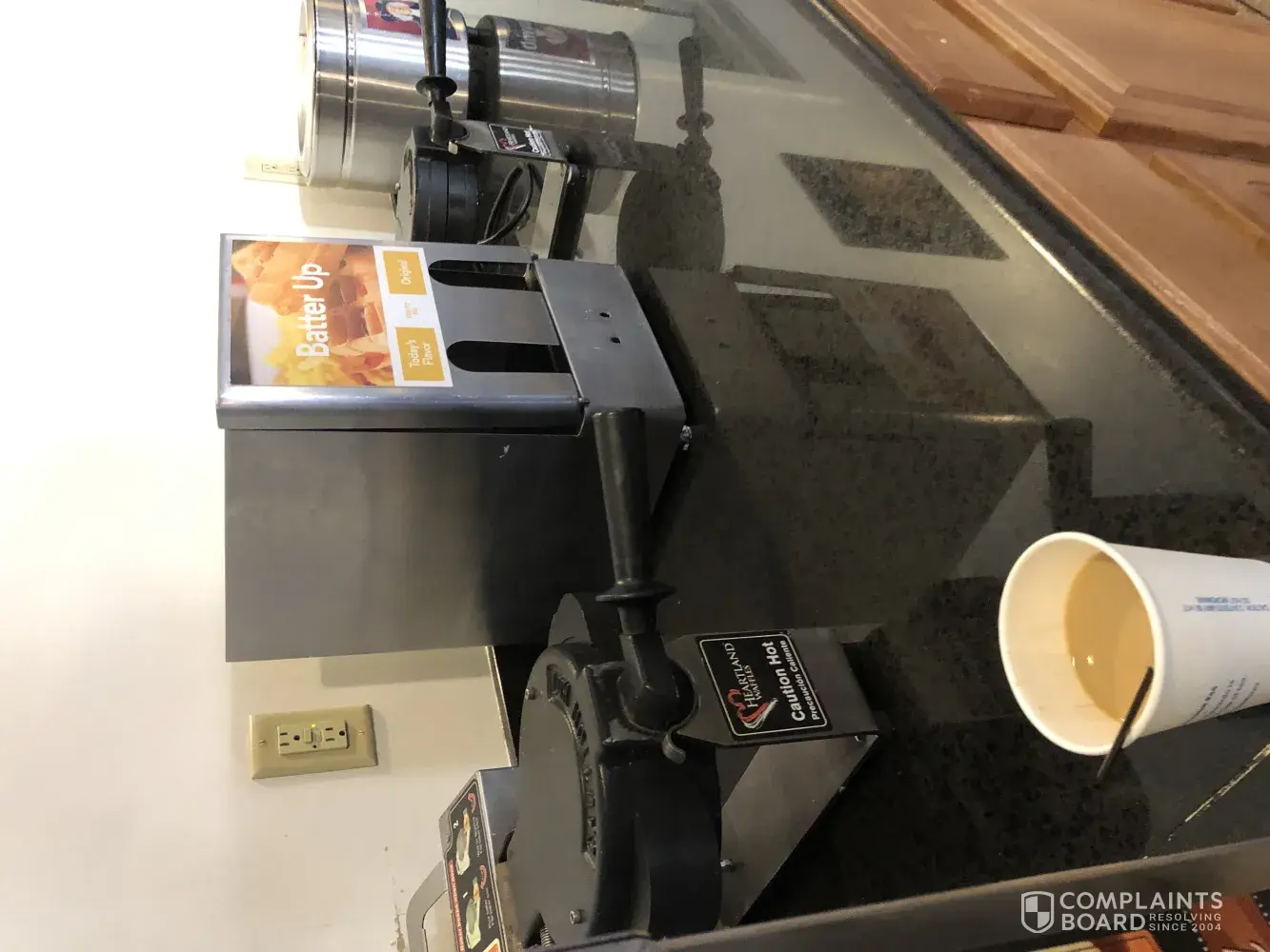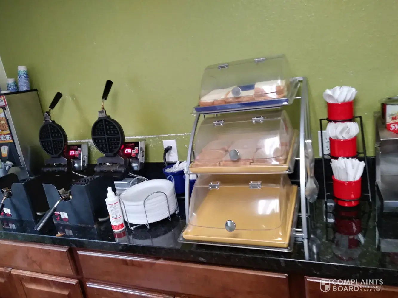 I didn't even use the bathroom except for the toilet 2x-it was not clean. No Kleenex, no toiletries. No coffee was made in breakfast room, & nothing but stale pastries and dirty waffle makers.