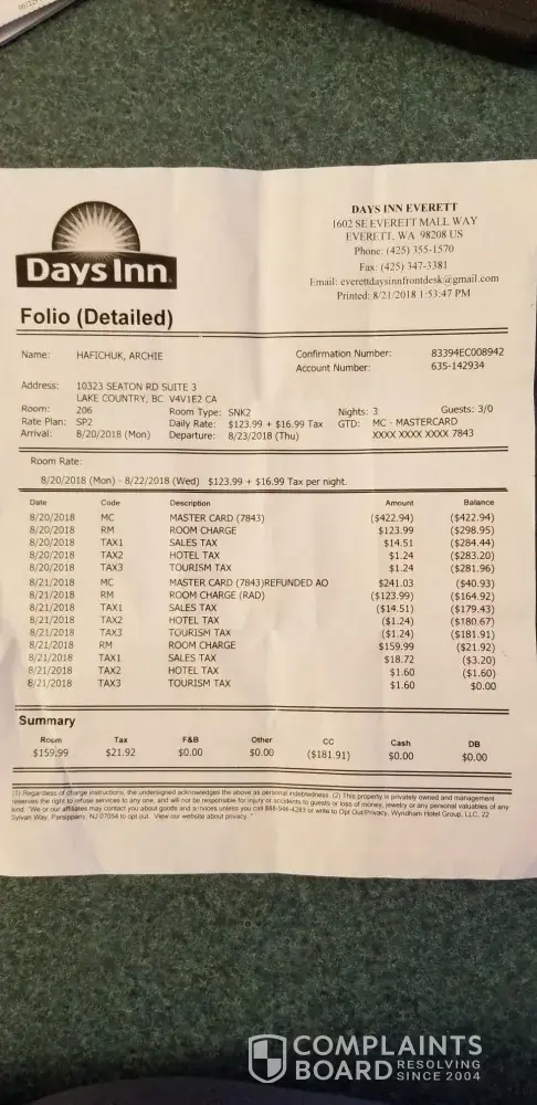 I posted about my experience on Facebook, and was messaged by someone from the days inn. They told me that the manager David would reach out to me and that they would be monitoring the situation. David did call me twice, but unfortunately we played phone tag for a few days. To remedy this issue, I called and spoke with someone at the hotel and told them to give David my email so that we could pinpoint a time to talk. This was about 2 weeks ago, and I have heard NOTHING. The last time I tried to reach out, I spoke with another employee and told him the issues I was having and to have David give me a call so that we could come to a conclusion about the issue. It's beyond disturbing to me how everything has been handled. I feel forgotten, and pushed to the side.