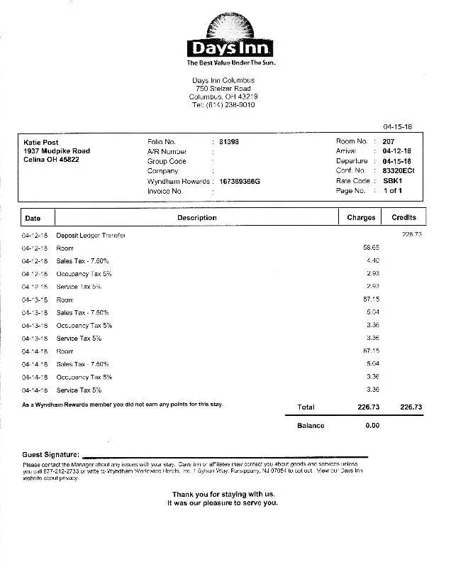I stayed at Days Inn Columbus Airport the address is 750 Stelzer Road, Columbus, Ohio 45822. The dates were April 12-15. I have a lot of problems with the stay.