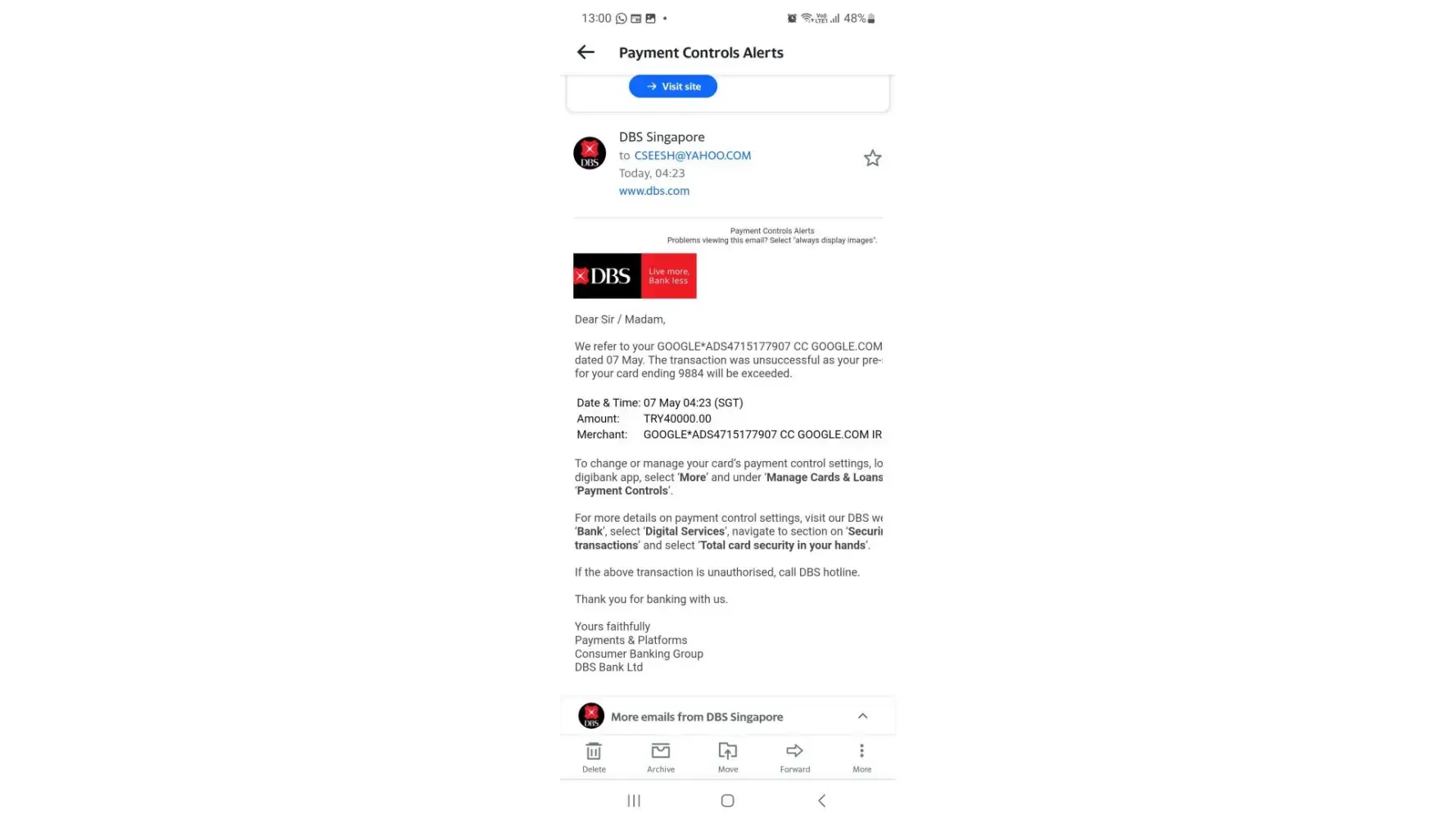 After the phone call, i also received an email from DBS that there was another transaction of TRY40000 attempted to be charged to my card but was unsuccessful due to limit exceeded.