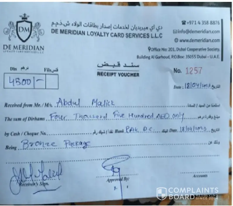 I have the same issue with company. De Meridien Loyalty Card - Dubai UAE. I am asking them to refund the money I paid.