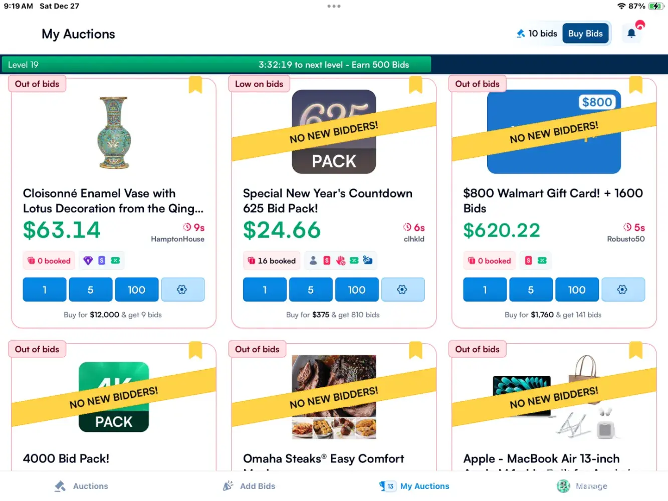 Despite this learning experience costing me $31.38 and about 8 hours of my time, there was some good news. I reached out to customer service and they immediately refunded my original bid pack and even converted the gift card into 300 more bids. So, I was back where I started with a pool of bids to use on the site. I'm sure I'll end up attempting to win something again, as the site is very addictive and time-consuming. However, I do recognize that it's basically low percentage gambling to win items that I could just buy and save myself a bunch of time.