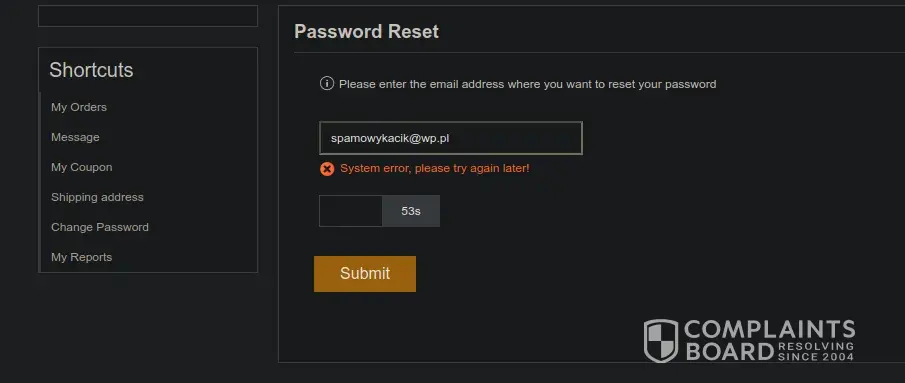 Today (21st Feb), when I am trying to reset password it shows me system error - attached here.