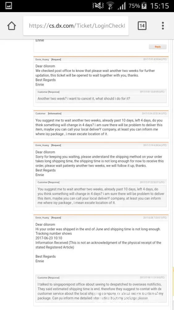 I had to call my post only to find out that the product is stuck and cannot pass through because they were missing a document.- DX should have known about this. When I told them (by sending several messages and finally calling them), they sent me yet another automatic reply by saying that I should wait, for another two more weeks.
