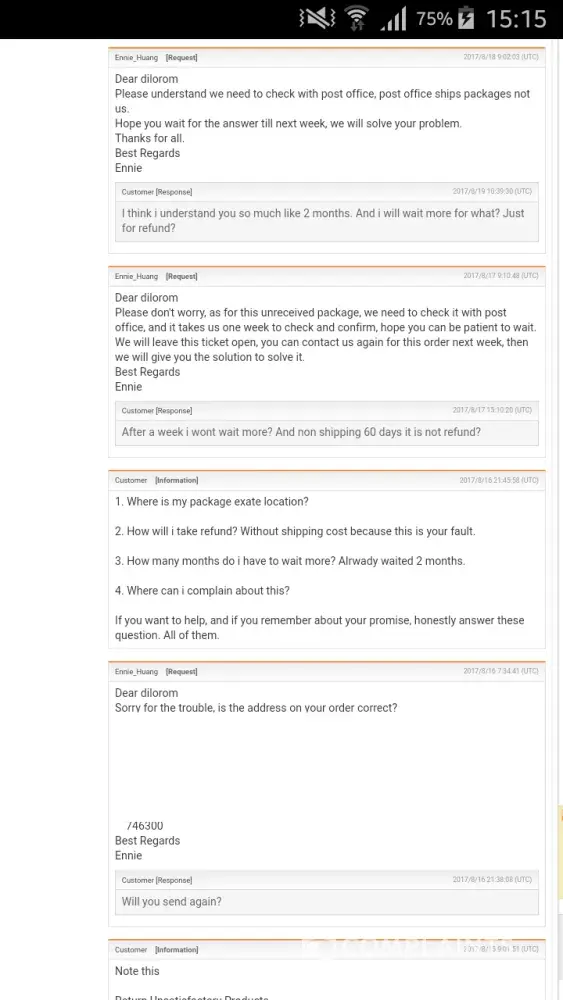 I'm on Day 112 of my (never-arrived) order. Around Day 70 I requested a Paypal refund, on Day 93 they offered me a refund and told me it would take 1-2 weeks because I had taken over 90 days(!), on Day 98 they asked me which email address I'd like my refund to be sent (!), and today I thought I'd find out why I don't have my refund. As they've closed my ticket, I've used Live Chat and been given "Starck" as an operator. I'm cutting out the part of the conversation where they told me my package had not been lost, but returned to them (as their English made the final fate of the parcel quite ambiguous).