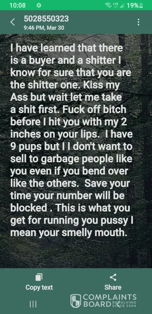 Wow you come on here and read comments about yourself. Keep in mind I have you're text threatening me. I posted it right on here so scroll up and read it. I will show everyone what you are all about Mr pervert puppy mill ðŸ˜