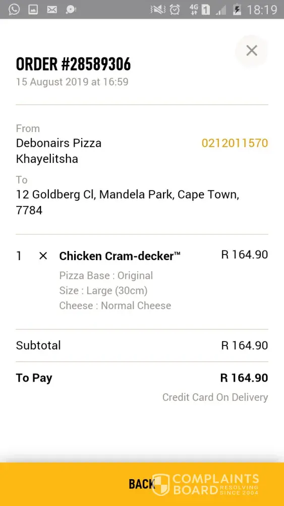I ordered pizza from Debonair's Pizza at 12:28 at 15:45 I called them back for the second time and this after I called their customer service center and seeked assistance via their app, and they told me that my order was delivered. Where, when I've been at home and received nothing. The driver argued that he made the delivery. They asked to call me back. 25 minutes later they eventually do but still argue that they made the delivery. When I tell them that I have information about my order backed up on my cloud and that the said address isn't the address I typed in, they started apologising and said that they will rectify the mistake. It's now 16:20 and I'm still waiting.
