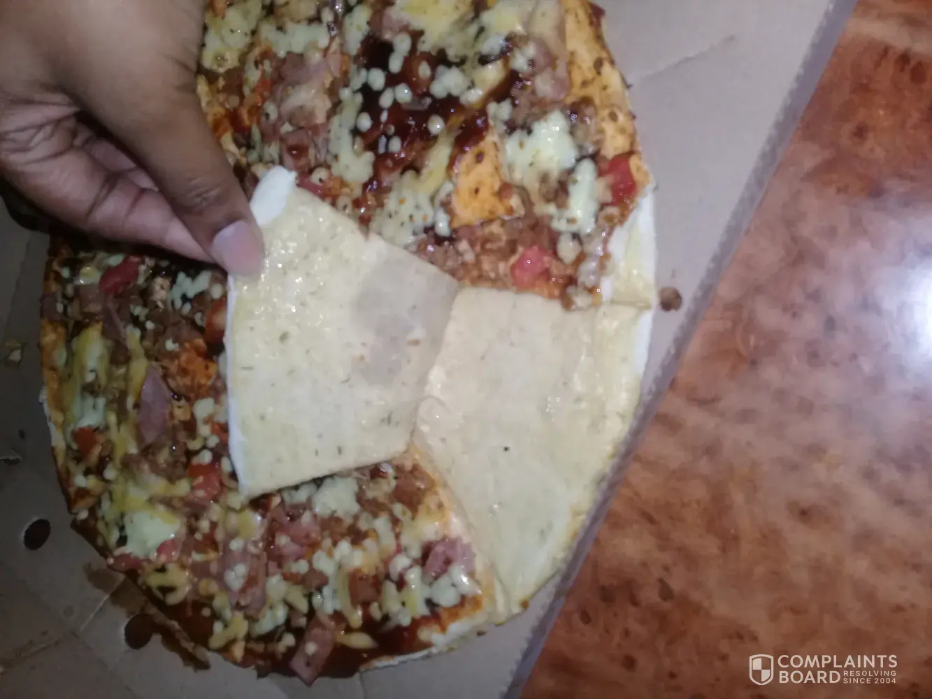 Purchased a meaty tripple decker pizza today at Roodepoort Lifestyle crossing. There was barely any ingredients on, no cream cheese at all the bottom pizza had nothing on at all a totally dried out base. My order number was 99.