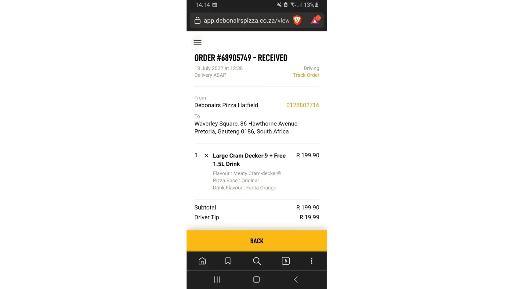 I placed my order (special on chicken cramdeck) online at about 12h40 on the 4 october 2022 and at about 12h53 i received a message confirming my order. At 13h45 i received a call from engen confirming my address. I was also told that they don't have 1.25 cold drink coke and i will be served with a pizza only.