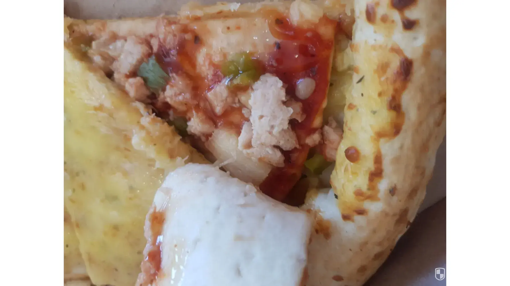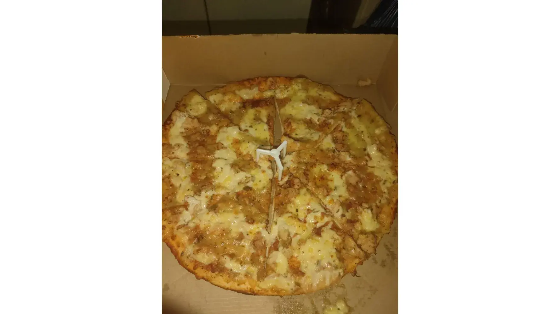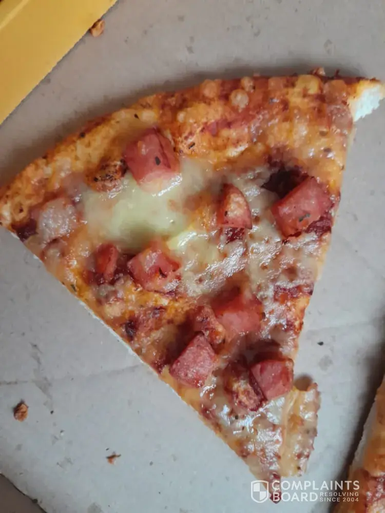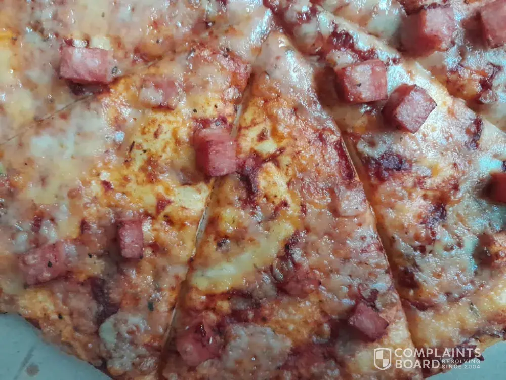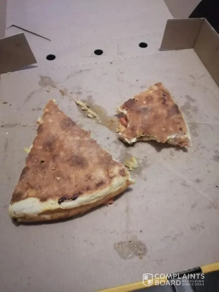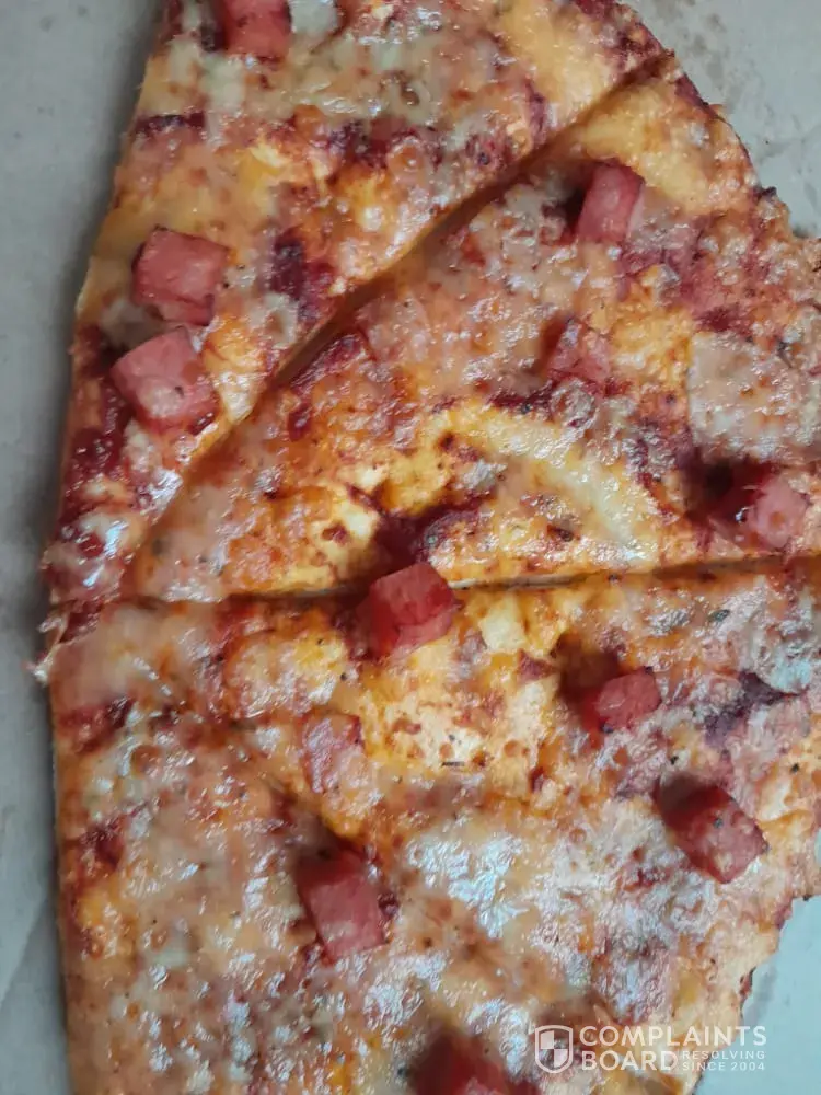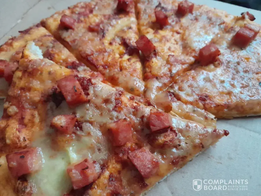 Pizza's crust was burnt and the overall pizza was dry and very hard to chew, it needed to be down with cold drink or juicy