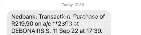 This base of the pizas we received were about 1mm thick, it was as if we were holding the topping directly in our hands, how yous have deteriorated, that is a sure way to close your doors, from now on I will be trying your competition for our Friday night Piza.Capitec: Purchase -R400.00 from SAVINGS ACCOUNT; Ref DEBONAIRS HIGHLAND MEW MEW NK ZA; Avail R10901.03; 12-Aug. Info [protected]