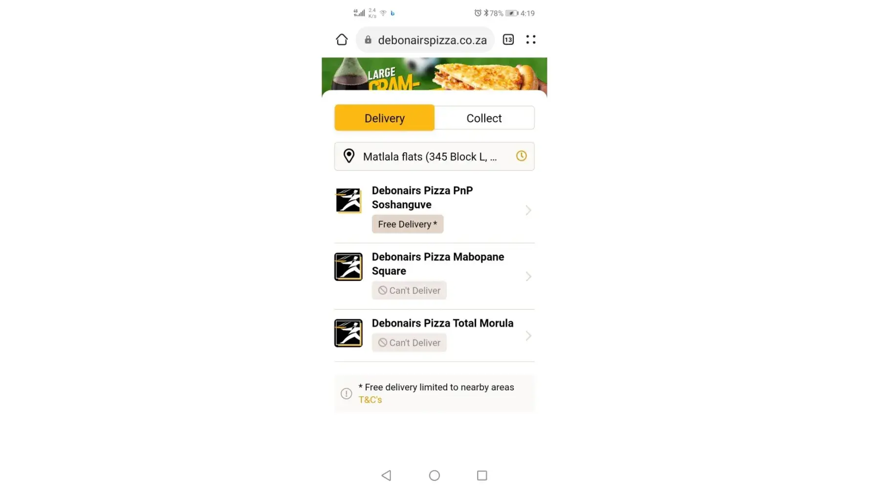 I order a pizza at 15:38 from debonairs pick n pay Soshanguve online, at 16:13 they send what'sapp saying they dnt deliver in my area, I must come and collect, I am the 1 calling, mind you the app gave their option for delivery and they hanged the phone while talking, even now at 17:32 I am still waiting for my delivery and am hungry