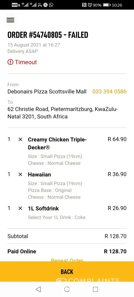 I place an order with debonairs scottsville in Pietermaritzburg on the 15th of August. My order was cancelled after payment was made. I received message that my refund will be processed, instead on the 18th of August payment was released from reserved which reflects as payment on my side.