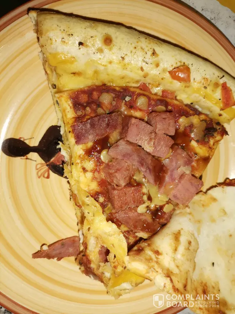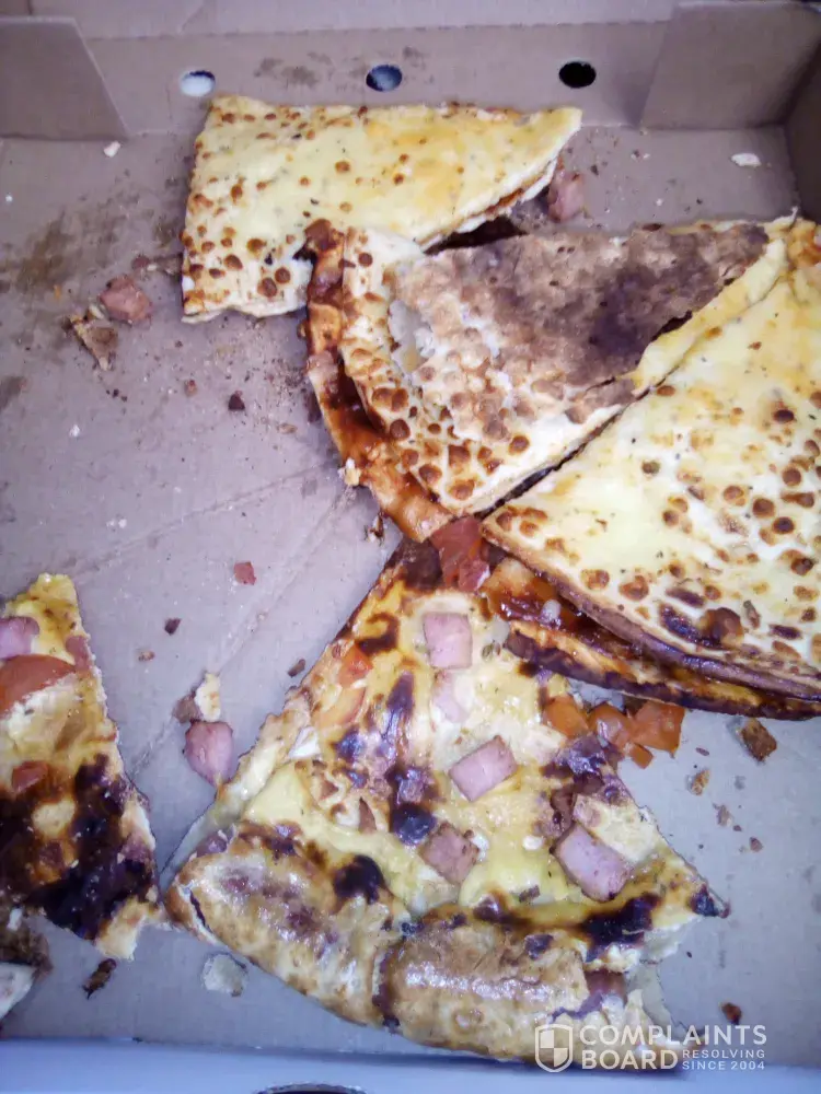 Ordered pizza telephonically today the 12th of February. The pizza arrived well on time. Mind you this was NOT the first time they serve me such. Thought I should give them the benefit of the doubt but today they took it too far. The Pizza I ordered had NO filling at all. The entire pizza was burnt. The base was beyond burnt. Even the cheese griller was burnt. i could count the pieces of ham. not more than 10 in the entire pizza. the pizza collapsed. I had to throw away the rest of the pizza. My R200 down the drain just like that. Don't know how they could serve me such. I want my money back asap. I will never order again