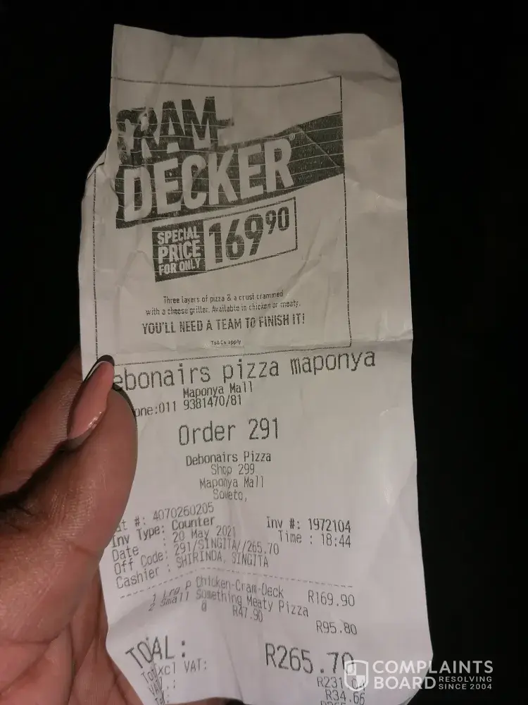 I went to debonairs Maponya Mall. The service is very very poor. I went to buy food for my children at 18:44 to buy a cramped crust pizza n two real deal pizzas. Yooo had to wait for 2hours to get my food I paid R265 just to chill in their waiting area. In that time I left my children in the car. When I ask the stuff that was at the door about my order she said their were still busy with the crust. I then asked about the boxes that were being put aside the lady did not even saying anything. I then I waited again n then came the urber eats guys also waiting for the food. I then went inside to ask for a refund and the lady just took my receipt n put it aside and left me standing at the counter. I felt that a level of service is not good and worse they did not communicate as in what is happening. I repeatedly asked for my receipt n for a refund but I was ignored. After an 2hours 30 min waiting they give me the pizzas still with no apology and all this happened after customers wanted to fight n hit the delivery guy. I am definitely no going to leave this as we're treated as if we coming to take credit but we are using our money. I work with customers also n I know how to treat customers but what they did as far as I know it's a service that could a fascinate a customer. Please assist as I ended up not enjoying the food as it was now late n my children had to sleep