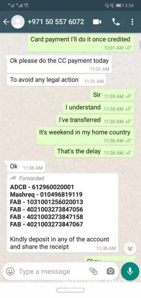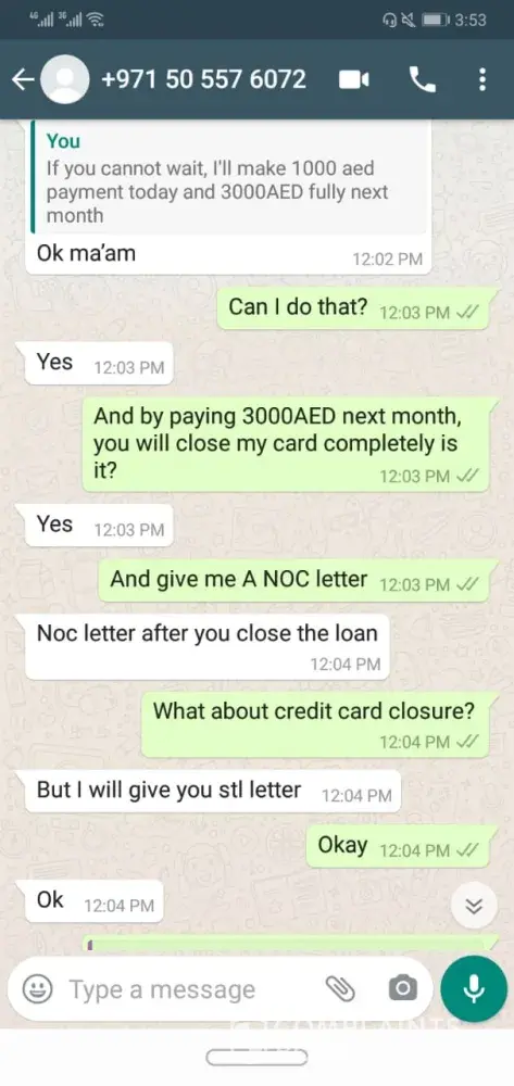 He started the conversation by agreeing to a settlement pay but never gave me a settlement letter, I cannot pay 1000 AED every month without a proper settlement plan or guidance, hence, I wrote an email, however, nobody contacted me for the same. Mr. Amjed keeps threatening me every month saying he will submit my cheque against both loan & credit if I do not make the payment. With all due respect, I'm not a defaulter with your loan & credit card all I started paying with an intention of closing it and by trusting his words. However, every month I'm being a victim of his threats (please check my screenshot) even today he did the same. I asked for the settlement plan, he sent a screenshot of my cheque to be submitted.