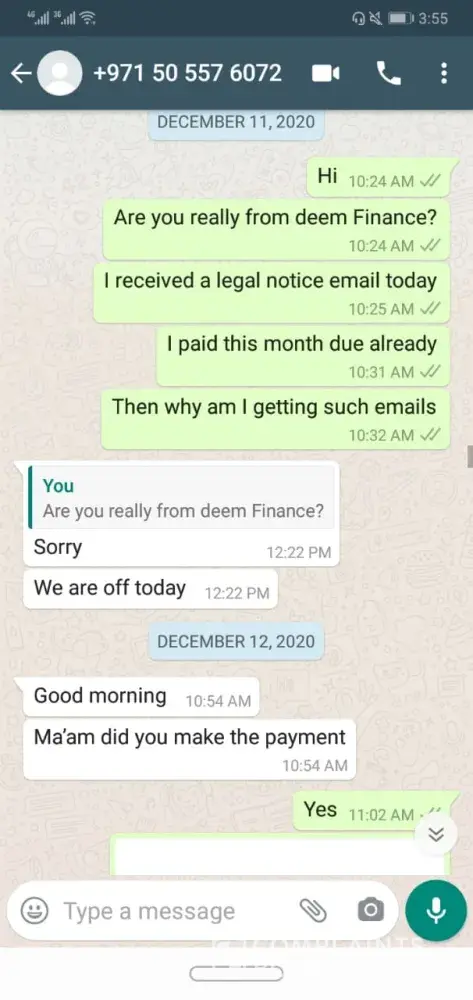 Please note that I have requested officially thru emails several times from Deem finance customer care and collection team to look into my request of deferment my personal loan installment but they never respond to my emails as well they are sending to me an official threating emails that they will share my details to the respective visa and immigration authorities and the Central Bank of the UAE and it will be with The consequences of such reporting will include a travel ban however I have only a delay of 23 days of one installment,