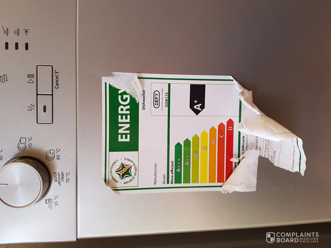 Bought my new dishwasher today. Tried to remove the sticker as per photo's attached - WAS NOT IMPRESSED. Defy can at least spend a few rands extra when procuring stickers.