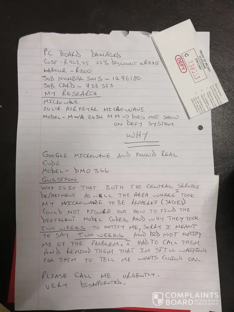 29/7 Received a message to say my Job no is (1312999) and has been allocated to the nearest DEFY service center and to contact [protected] should I have any queries.