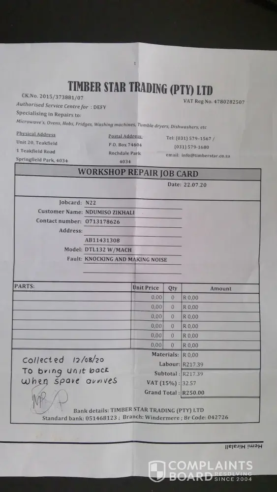 I sent the washing machine to Defy Authorised Repair Centre in Springfield (Durban) on 20 July 2020. The issue with the machine was a knocking noise when operating, but it was in a working order. I paid R250 for diagnostics and I was advised that the repairs will be 2 to 3 days. Days went by and no response from Defy. I followed up weeks later and I was told they're still waiting for a motor which seems to be a problem with the machine. On 12 August 2020, the motor still had not arrived and therefore the machine was at their workshop. I asked if I could collect the machine and carry on to use it until the part arrives and I was advised by Vikesh that I can collect and use the machine. Collected the machine, connected it up and the machine was not working anymore, obviously after they opened it up for diagnostics. The most frustrating part is that I have never received any phone call from Defy notifying about the status of the order. Every time I phone I'm getting told, over and over again, that they're waiting for the part (motor). Nobody has an indication of when will the motor arrive and I have been sitting without the machine from 20 July 2020. This is very inconvenient and frustrating at the same time.