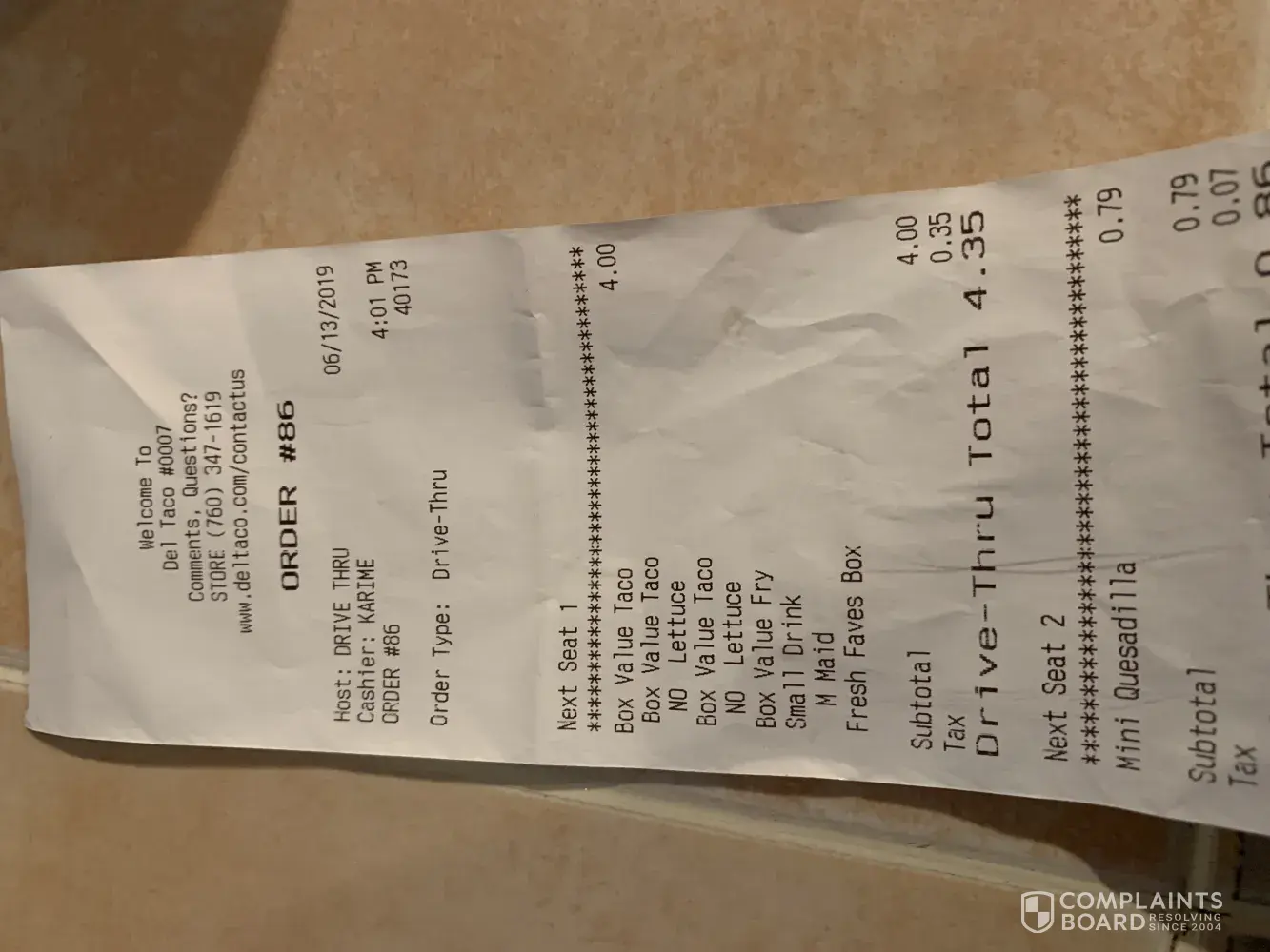 I went to drive through at 4:01 pm 6/13/2019 . I ordered a Value Box Taco with no lettuce and mini quesadilla plain. When I got home we to eat our meal and notice it was a chicken taco with no lettuce and some kind of sauce. So I called Taco Bell to speak with the manager and ask her name but she hesitated to give me her name but she said that her name as Christina from store number 0007. So I told her about our food being wrong and she said I would have to go back with receipt and food that we are 15 min away. I told her I was not going back out being 114 degree heat. And she said that that was the only she could fix it. So then I ask for the Corp number and she said that they weren't Corp and hat they were franchised. Then she said that that the way they hassle any problems of food. So we wer talking and she just Hong up in our conversation to get it resolved. So I called again and the phone just rang and rang until the phone went dead. So I called again and it rang and a worker pick up the phone and ask for the manager but they said that the manager left .so then I told the worker to take down my name and order number for my recipe. To let them know that I going back tomorrow with the receipt number 86 with bar code 255547357036. Then the worker told me the same thing to bring everything back. As the same time she covers the phone and was speaking to someone else. So I told the worker to give me the store manager and told me that they are not allowed to give out manager names. Then they just hanged up the phone on me again. That's whey I'm here staring my complaint. Thais store has no respect to the customer and totally very un-professional . I don't know what is your policy on these kind of matters but I know further hanging up in a costumer it's totally unprofessional. Please look into this matter it could of been handle in a more professional way.