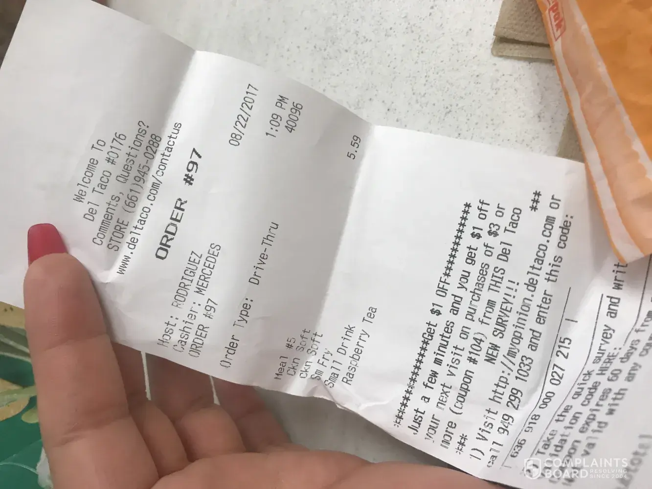 I went to Del Taco in Mission Viejo at 9:38 a.m. on 9-25- 17 and I ordered a carne asada epic Scrambler burrito and I got something else instead not sure what it is but it has carne asada, refried beans, tomatoes and avocado sauce. this is the second time at this location this has happened. This location and other locations don't seem to get my order correct and I go to Del Taco several times a month. I'm about ready to hang Del Taco up and go somewhere else. Another complaint I have at this location is I ordered a minie shake and it tasted like water . It was a $1.00 but I expected it to taste good and without water added. I won't buy this again.
