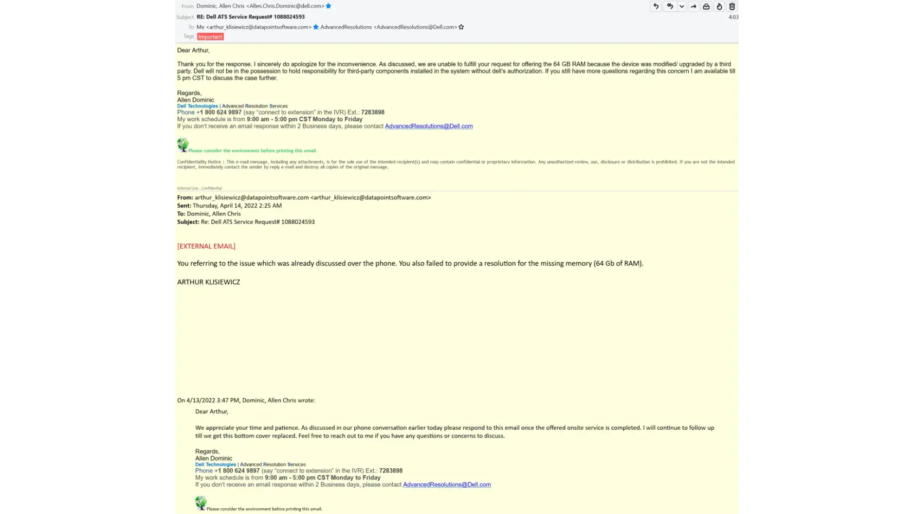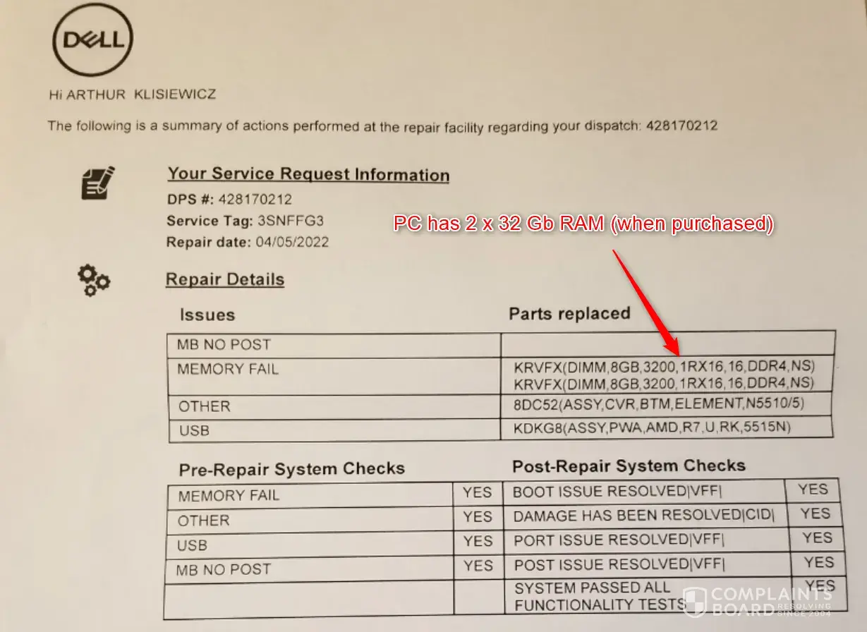 Desired outcome: I request DELL to:- return stolen 64 GB of RAM ( 2 x 32 Gb DDR-4)- send replacement enclosure- reimburse me for data restoration (aprox 2-3 hrs work)I can also accept equivalent of $500 check to cover all expenses.