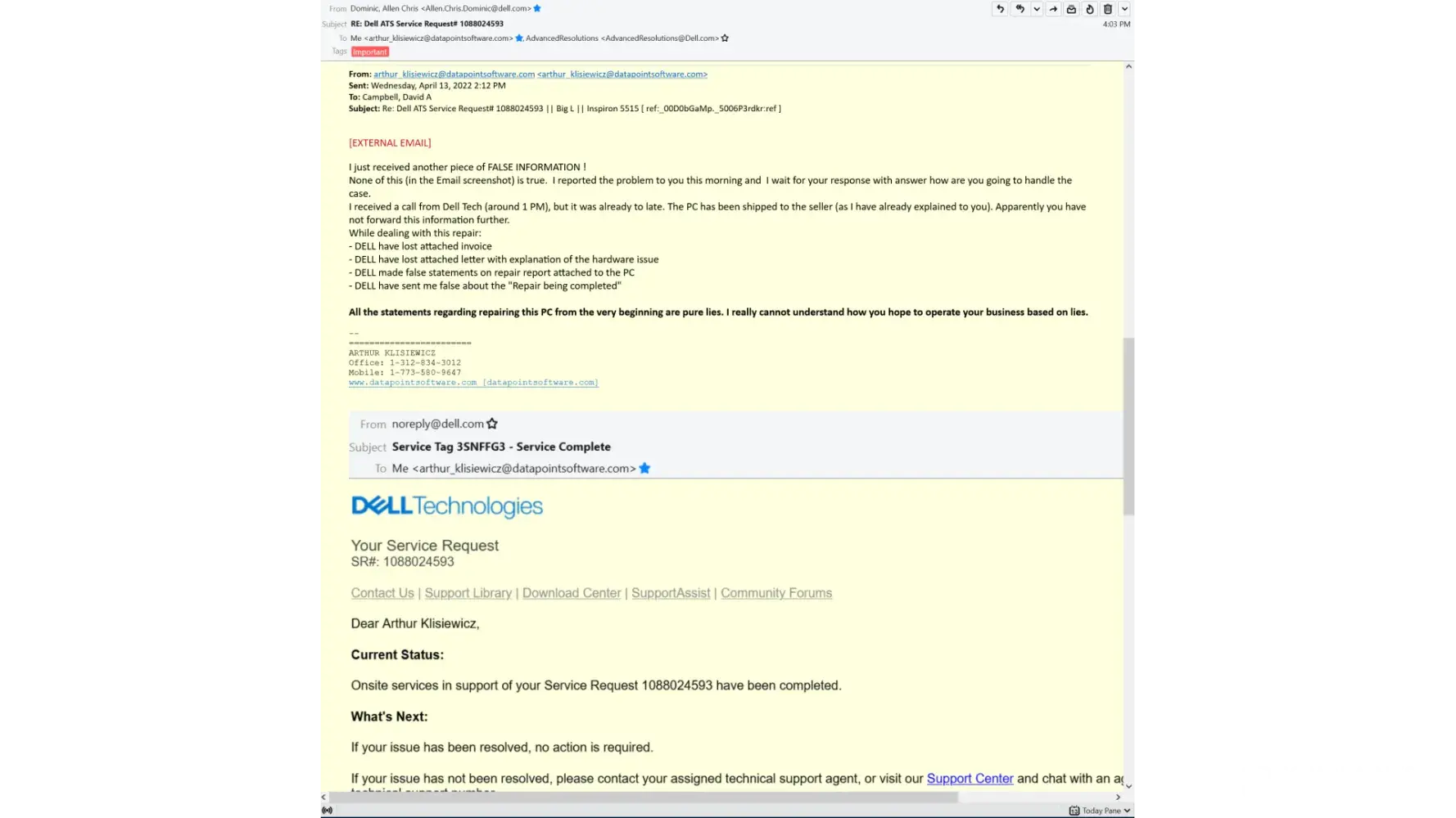 Dell Service request [protected] created: oct 13, 2021 (8 days ago)