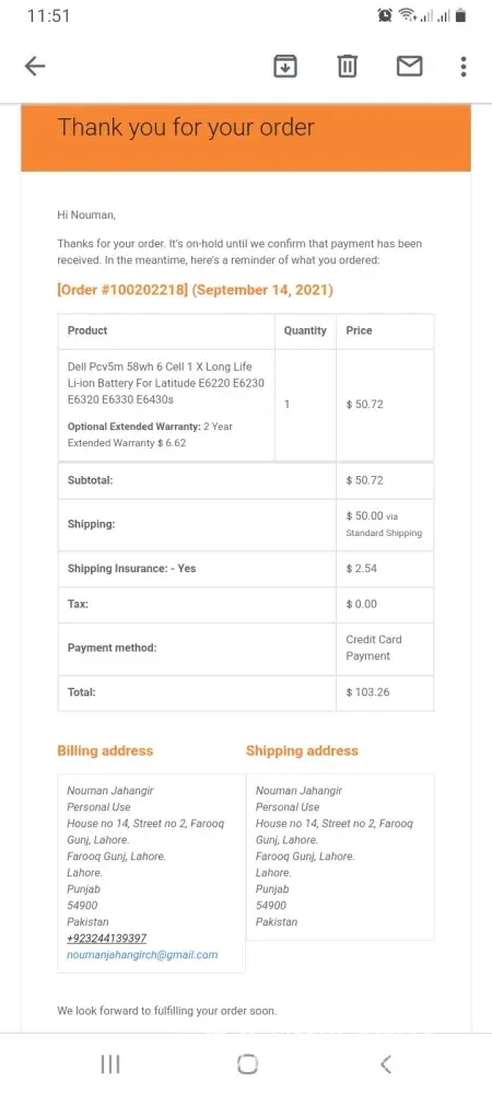 Yesterday at around 11:30am I ordered a battery for my Dell Laptop E6320 without any inquiry about them. After a ment I thought that they can be scammers so I emailed them and requested them to cancel my order and return my money. At night after 12 hours they deducted $103.83 from my card and after 10 minutes they told me that my order has been canceled on my request and that my full payment has been refunded. But till now after the passage of 12 hours I haven't received my money back into my account. Kindly ask them. or do something in order grant my money back to me!