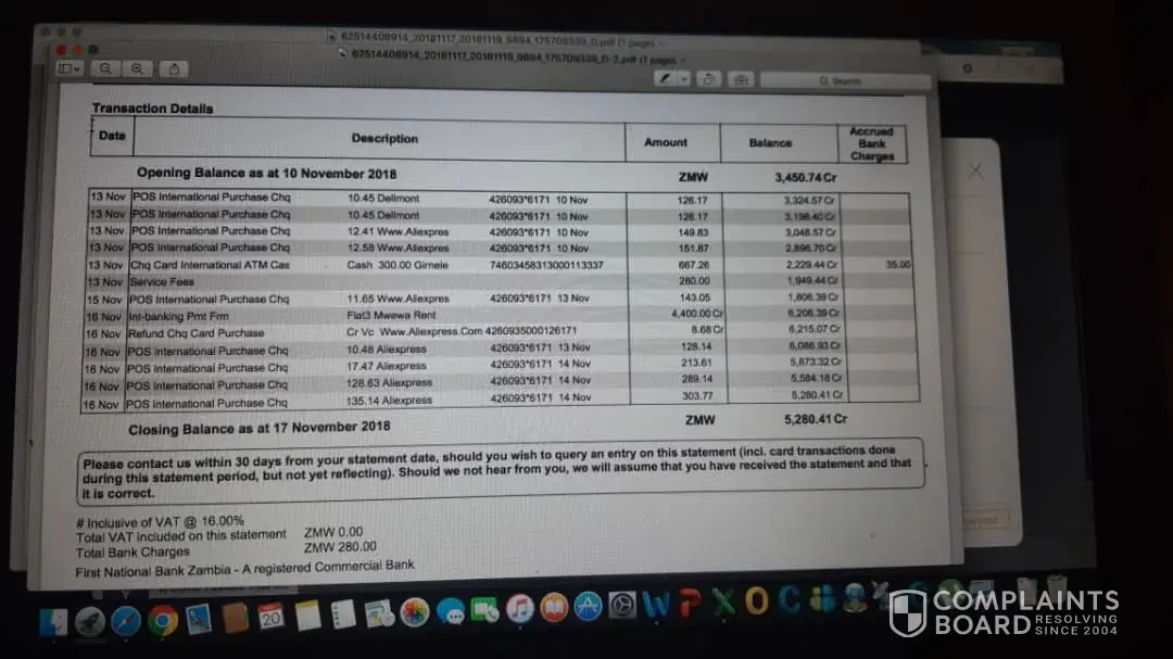 There have been a number of transactions made onto my card for Dellmont payments. POS international purchase chq 10.45 Dellmont -----------6171 10th nov amount 126.17 Zambian Kwacha. POS international purchase chq -----------6171 10th nov amount 126.17 Zambian Kwacha. These are only a few recent examples of the lost list of transactions made. This has been going on since September along with unauthorized purchases from Ali express to an unknown address and unknown cell phone number. I have never bought anything from Ali express and all of these purchases happened after your company charged me when I have never ever had anything to do with your company. I would like for you to cancel all the purchases and refund my money. I have over 500 dollars of unauthorized money missing in total. I need to get to the bottom of why this has been happening without my notice and who or what is behind this as well as why your company is charging me. I can send you all the information you need.